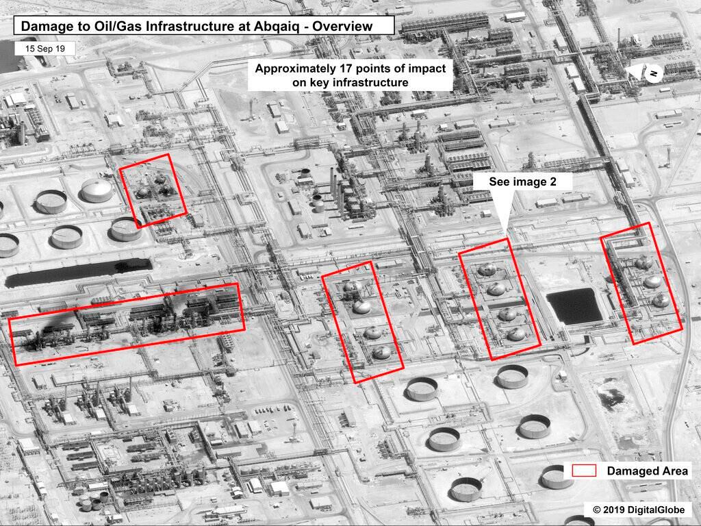 Estados Unidos publicó el lunes de madrugada imágenes por satélite que mostraban los daños en la planta de procesamiento de crudo de Abqaiq y un importante campo petrolífero, afirmando que el patrón de los impactos sugería que el ataque del sábado se lanzó desde Irak o Irán, y no desde Yemen, como proclamaron los rebeldes hutíes a los que apoya Irán en ese país.