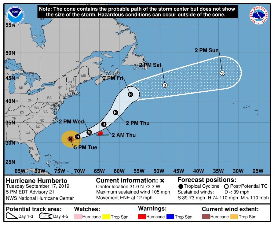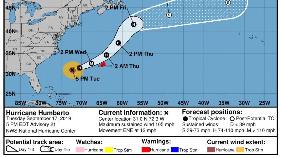 El Centro Nacional de Huracanes dijo que los vientos máximos sostenidos de Humberto se fortalecieron la tarde del martes a unos 185 kilómetros por hora (115 mph) y probablemente permanezca como un huracán de categoría 3 hasta el jueves. Su vórtice se ubica unos 655 kilómetros (405 millas) al sur-suroeste de las Bermudas y se mueve al este-noreste a 19 km/h (12 mph).