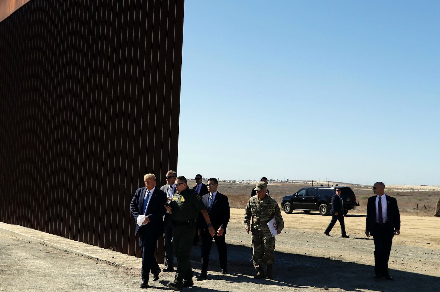 Trump recorrió un tramo del muro fronterizo en el área de Otay Mesa en San Diego. Es la primera visita del mandatario al lugar desde marzo de 2018, cuando acudió a ver prototipos de muro que las autoridades destruyeron posteriormente para hacerle espacio a 22 kilómetros (14 millas) de acero y bolardos rellenos de concreto actualmente en construcción.