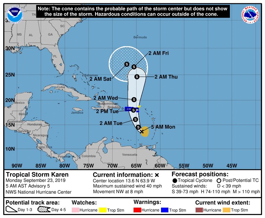 Un aviso de tormenta tropical está en efecto para Puerto Rico, Vieques, Culebra y las Islas Vírgenes Estadounidenses a medida que la tormenta tropical Karen avanza hacia el Caribe aunque sigue desorganizada.