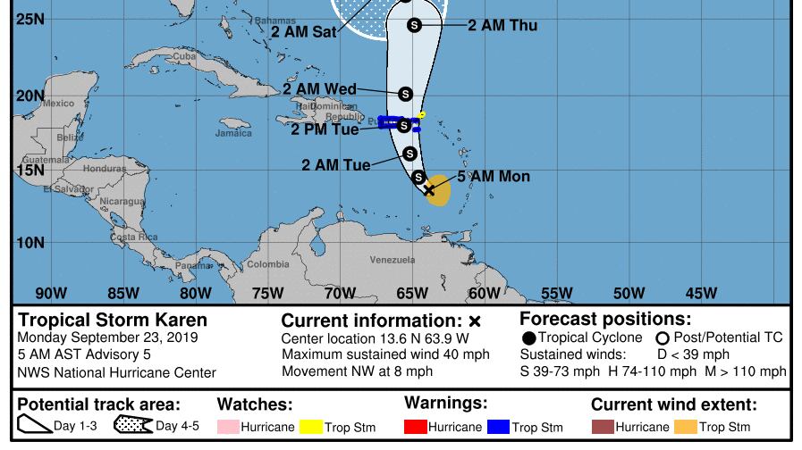 Según el informe, el centro de la tormenta tropical Karen estaba ubicado cerca de la latitud 13.6 grados norte, longitud 63.9 grados oeste y se está moviendo hacia el noroeste cerca de 8 millas por hora (mph).