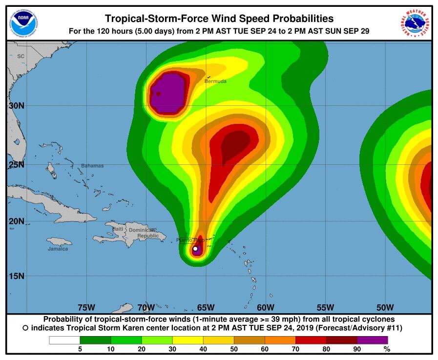El Centro Nacional de Huracanes informó que el centro de la tormenta Karen pasó por las islas municipio de Vieques y Culebra durante la noche de hoy.