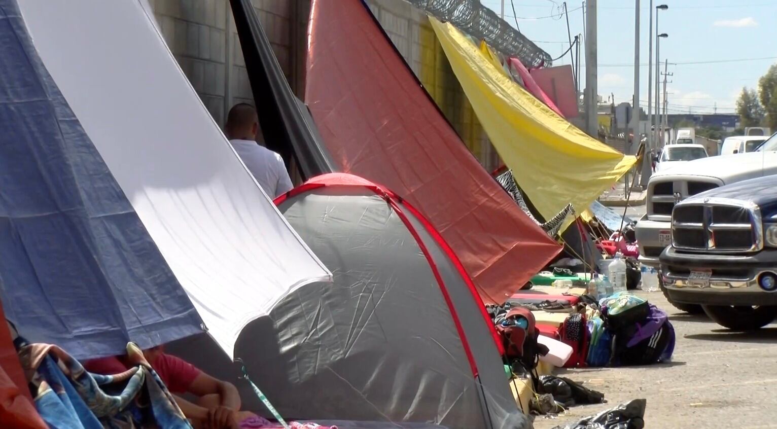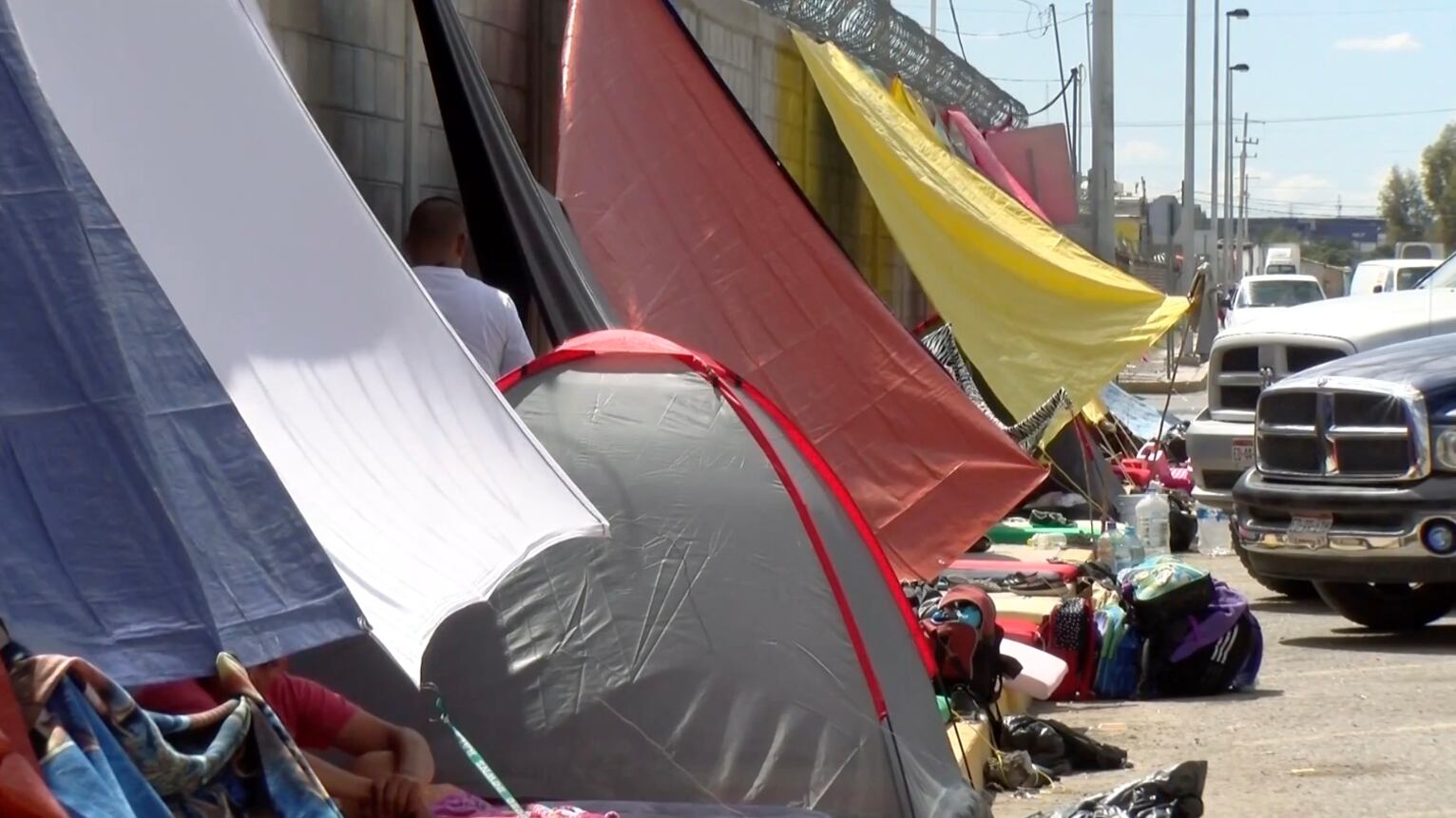 Las imágenes grabadas el lunes muestran a migrantes mexicanos acampando junto al puente internacional Paso del Norte, que conecta Ciudad Juárez, Chihuahua, con El Paso, Texas. Se pueden ver las tiendas de campaña y los cartones en los que pasan el día y duermen, y las lonas que cuelgan para protegerse del sol.