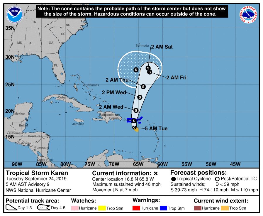 “Karen se está moviendo hacia el norte cerca de 7 millas por hora (mph) y se espera que este movimiento general continúe hoy. Se pronostica un movimiento de norte a nordeste esta noche hasta el miércoles por la noche. El centro del sistema pasará cerca o sobre Puerto Rico y las Islas Vírgenes hoy y luego se moverá sobre el Atlántico occidental esta noche y el miércoles”, indica el reporte.