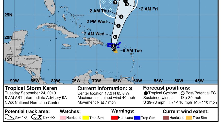 “Karen se está moviendo hacia el norte cerca de 7 millas por hora (mph) y se espera que este movimiento general continúe hoy. Se pronostica un movimiento de norte a noreste esta noche hasta el miércoles por la noche. El centro del sistema pasará cerca o sobre Puerto Rico y las Islas Vírgenes hoy y luego se moverá sobre el Atlántico occidental esta noche y el miércoles”, indica el reporte.