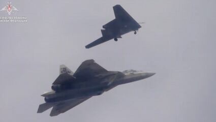 El dron de combate ruso Ojótnik realizó su primer vuelo conjunto con un caza Sukhói Su-57 de quinta generación, como muestran estas imágenes publicadas por el Ministerio de Defensa de Rusia el viernes.