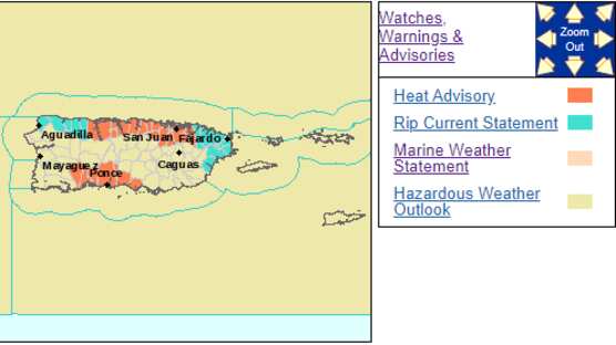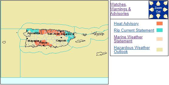 Sin embargo, las áreas entre Arecibo y San Juan y alrededor de Ponce pueden experimentar índices de calor de hasta 110 grados. Como resultado, una advertencia de calor está en efecto para esas áreas hasta las 6:00 de la tarde.