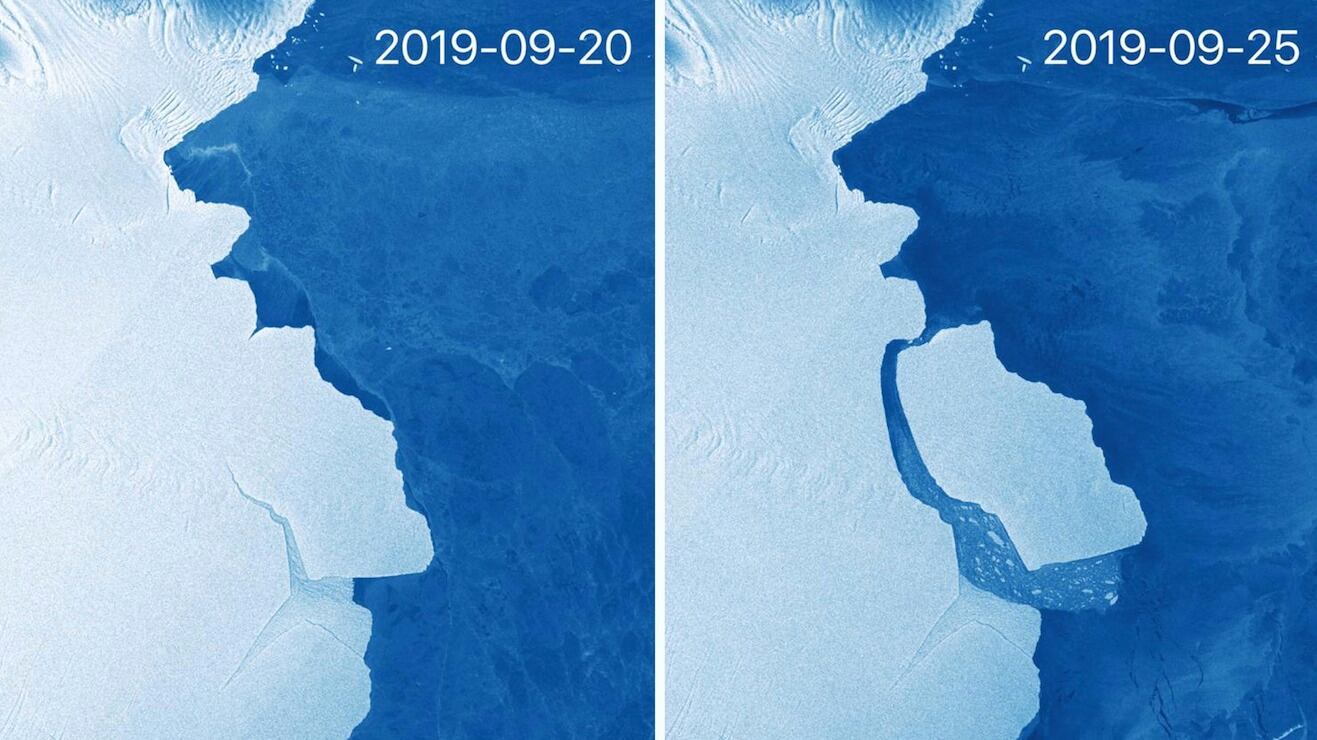 El tuit va acompañado de dos imágenes capturadas y procesadas por el satélite Sentinel 1: En la primera, del 20 septiembre, se aprecia una grieta en Amery, mientras en la segunda, de cinco días después, el iceberg está completamente separado de la plataforma de hielo.