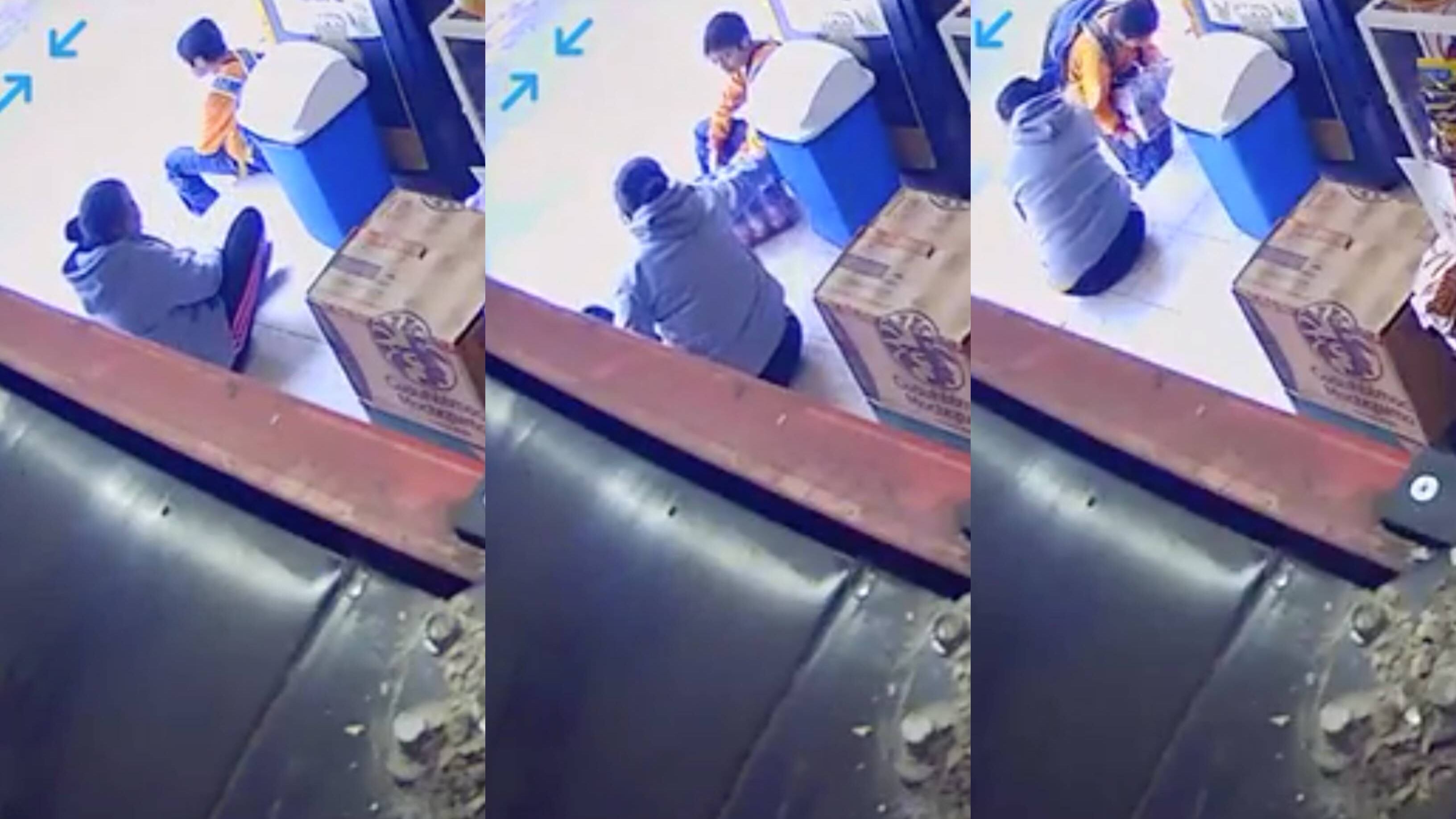 Las imágenes muestran cómo la madre se encuentra sentada con el menor a las afueras del local, cuando ella comienza a darle indicaciones y hacerle ademanes; momentos después, la mujer jala un paquete con lo que parecen ser bebidas y le pide al niño, quien reacciona confundido, que lo cargue y escape del lugar.