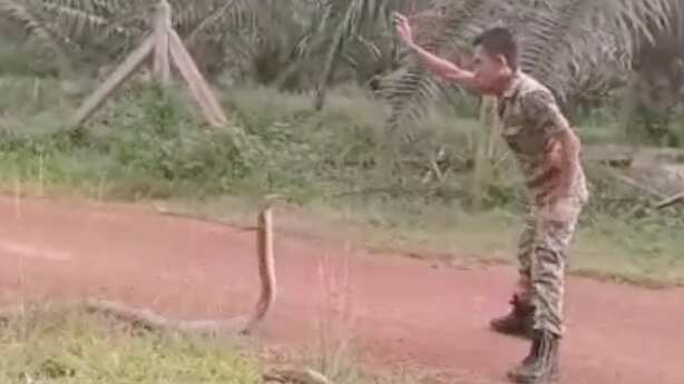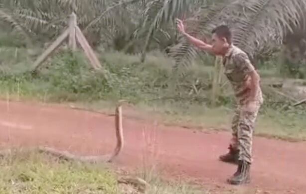 El registro, que fue compartido por un equipo militar con sede en Malasia, muestra al hombre reaccionando bastante tranquilo y seguro ante el reptil, colocando incluso sus manos a los costados en una pose que demuestra una notoria calma.