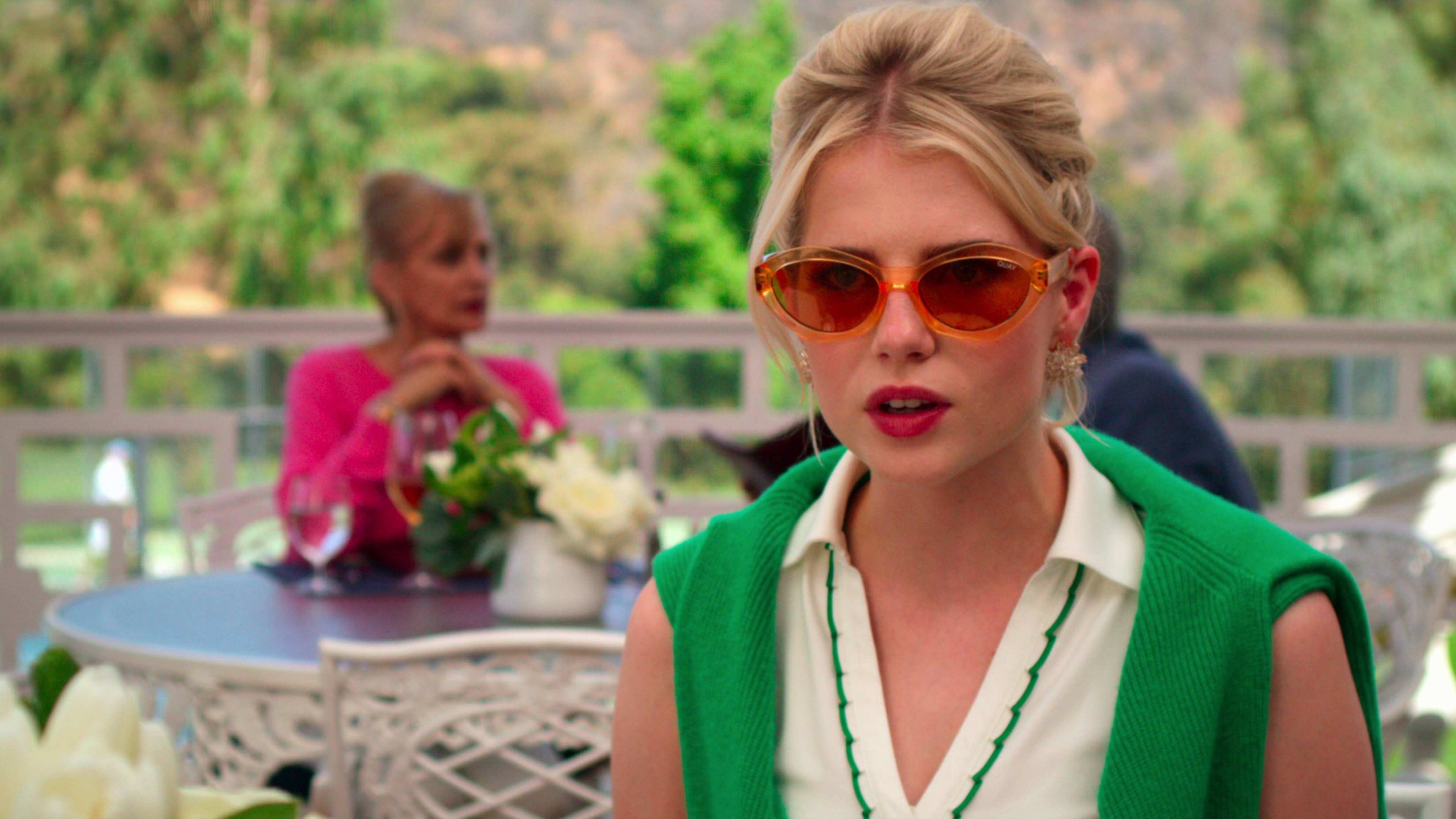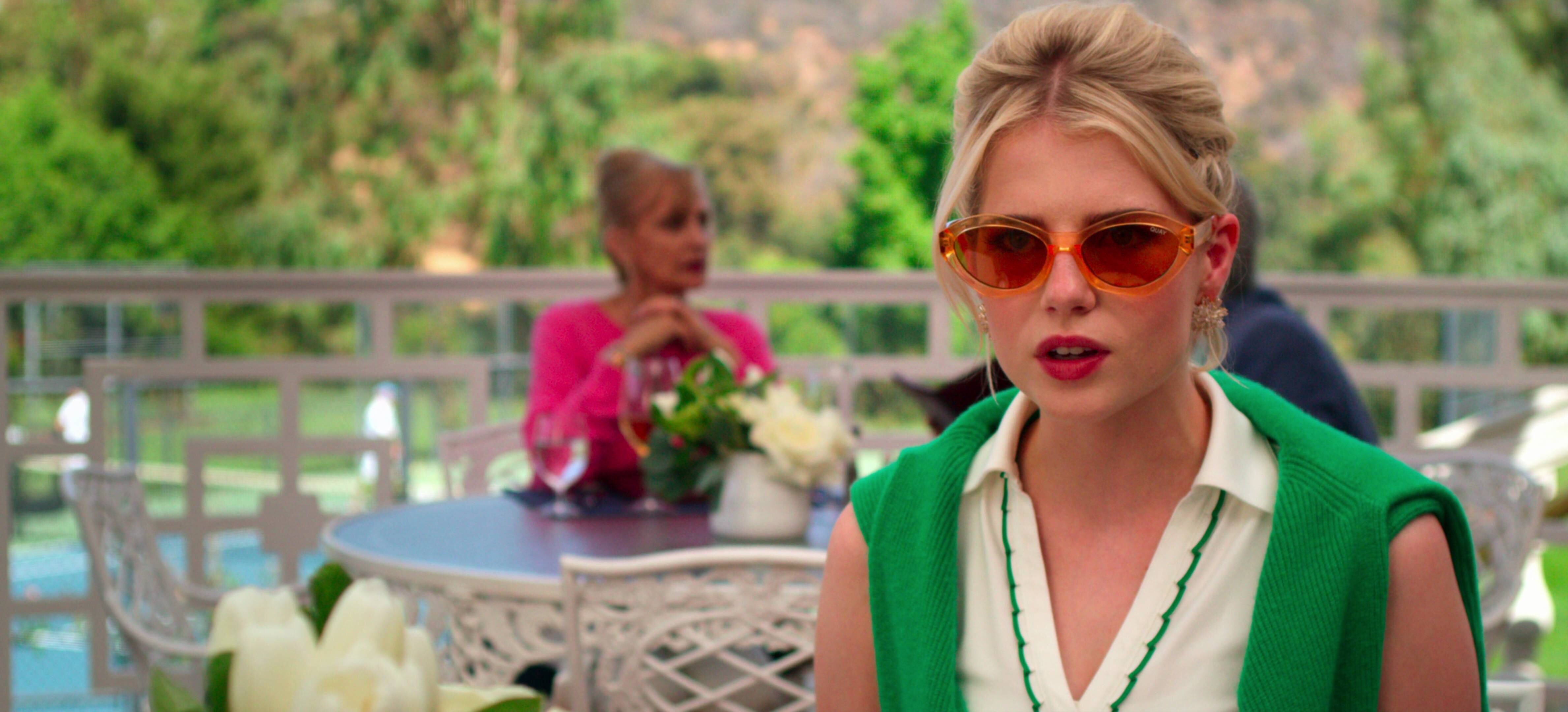 Se pensó en el vestuario del reparto evocando ese espíritu de la California de los años 70 y la influencia fotográfica de Slim Aarons, quien destacó por retratar a las socialités con esos tonos suaves de Palm Springs.
