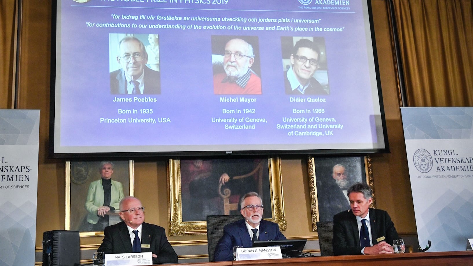 James Peebles, de 84 años, investigador de la Universidad de Princeton, recibió el premio por “descubrimientos teóricos en cosmología física”, en tanto los suizos Michel Mayor, de 77, y Didier Queloz, de 53, ambos de la Universidad de Ginebra, lo recibieron por descubrir “un exoplaneta en órbita alrededor de una estrella de tipo solar”, dijo el profesor Goran Hansson, secretario general de la Academia Real de Ciencias sueca.