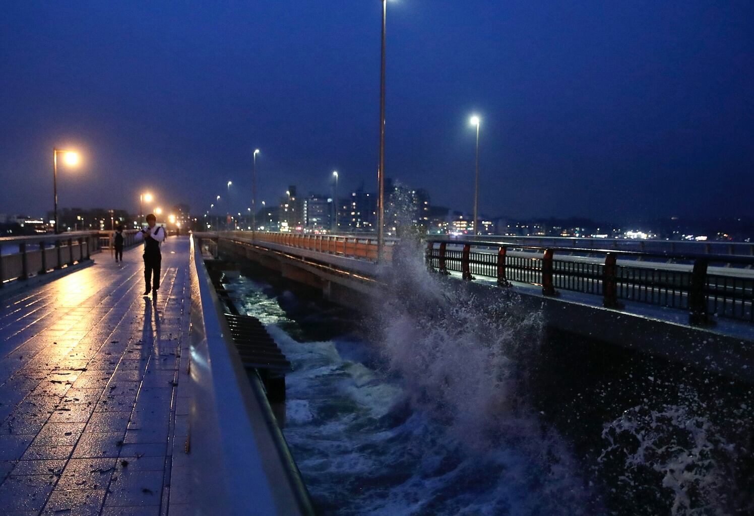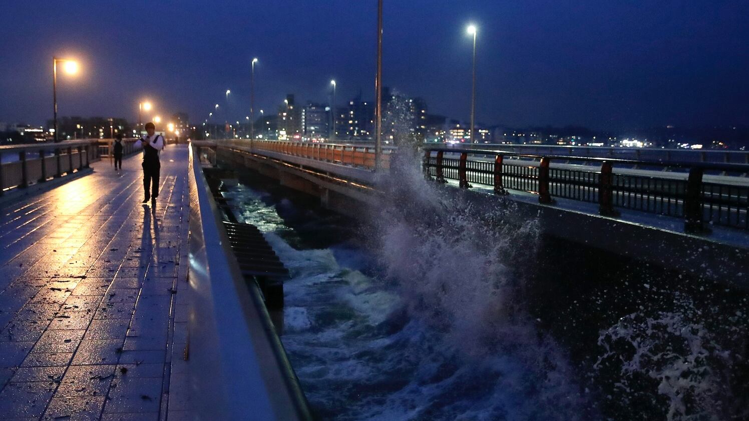 Las calles y estaciones de trenes están inusualmente silenciosas mientras la lluvia cae sobre la ciudad. Los estantes de las tiendas están vacíos después de que los habitantes se abastecieron de agua y alimentos. En las playas cercanas no se ve un solo surfista, sólo olas imponentes.