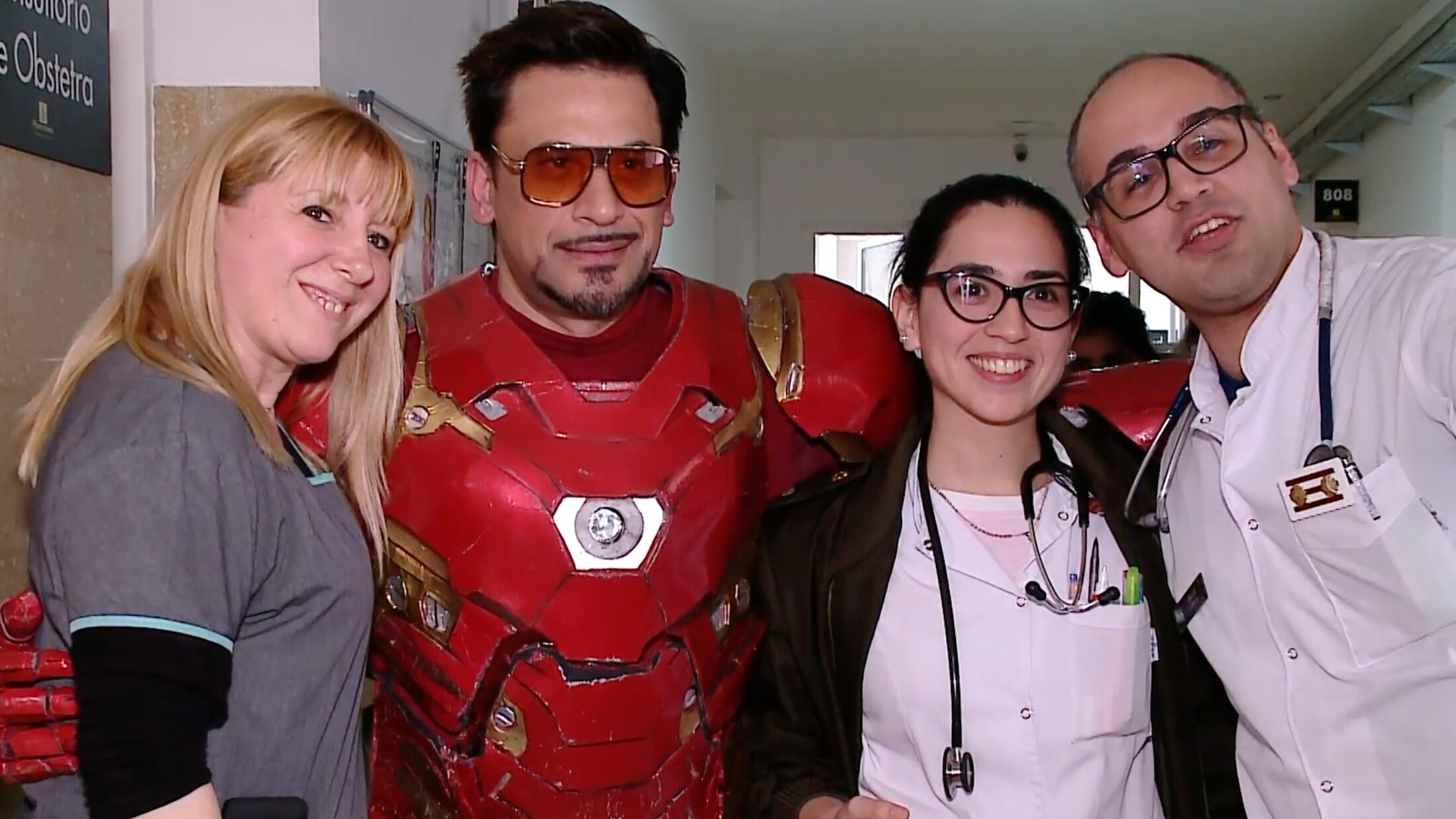 El argentino Iron Man no sólo anima a los niños, sino también a sus padres y al personal del hospital, ellos se muestran sonriendo y bailando con el imitador.