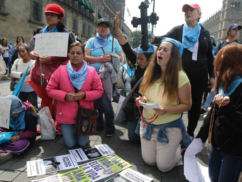 Con rezos, pañuelos azules y mantas, un grupo de personas se manifiesta afuera de Palacio Nacional, en demanda de que el presidente Andrés Manuel López Obrador intervenga ante la Cámara de Diputados para que sea rechazada la iniciativa que legaliza la interrupción del embarazo.