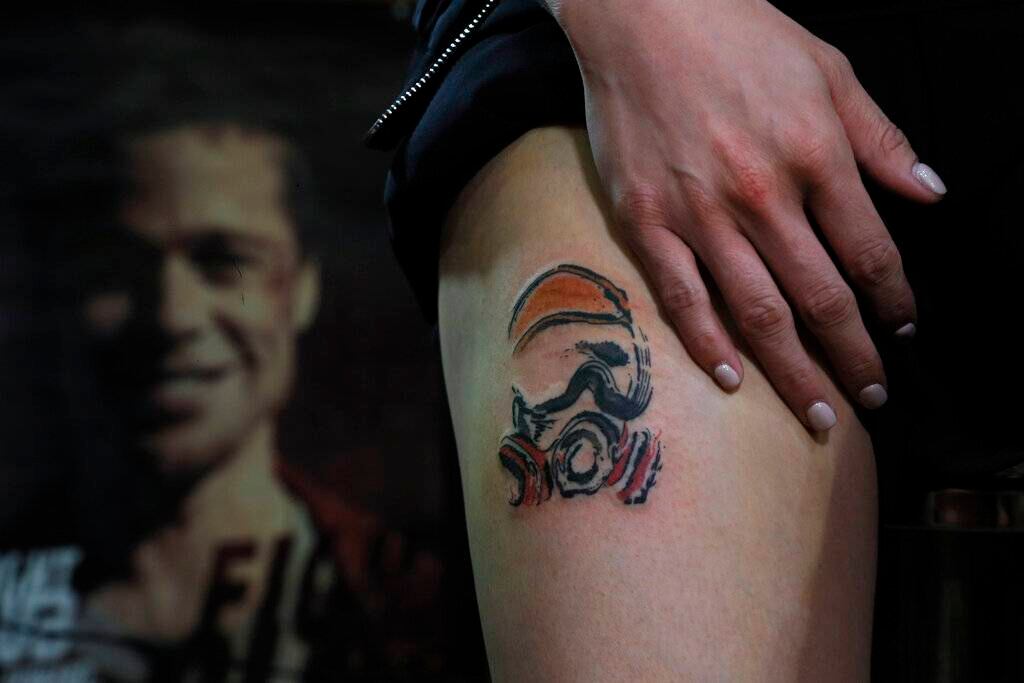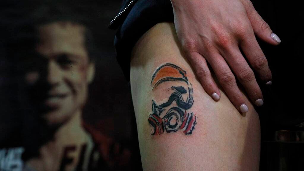 Las agujas de Mike Chan suenan como un zumbido mientras diseña un tatuaje en el muslo de una clienta: Una figura con un casco, gafas protectoras y una máscara.
