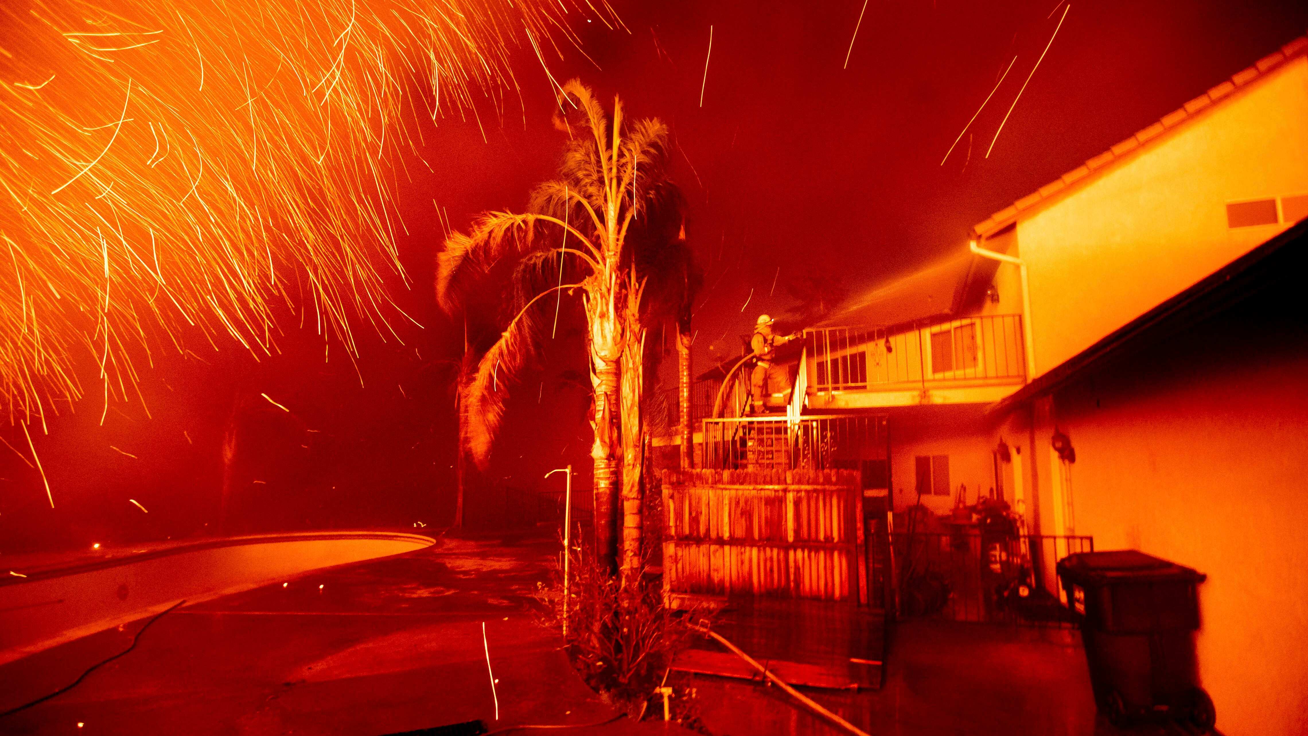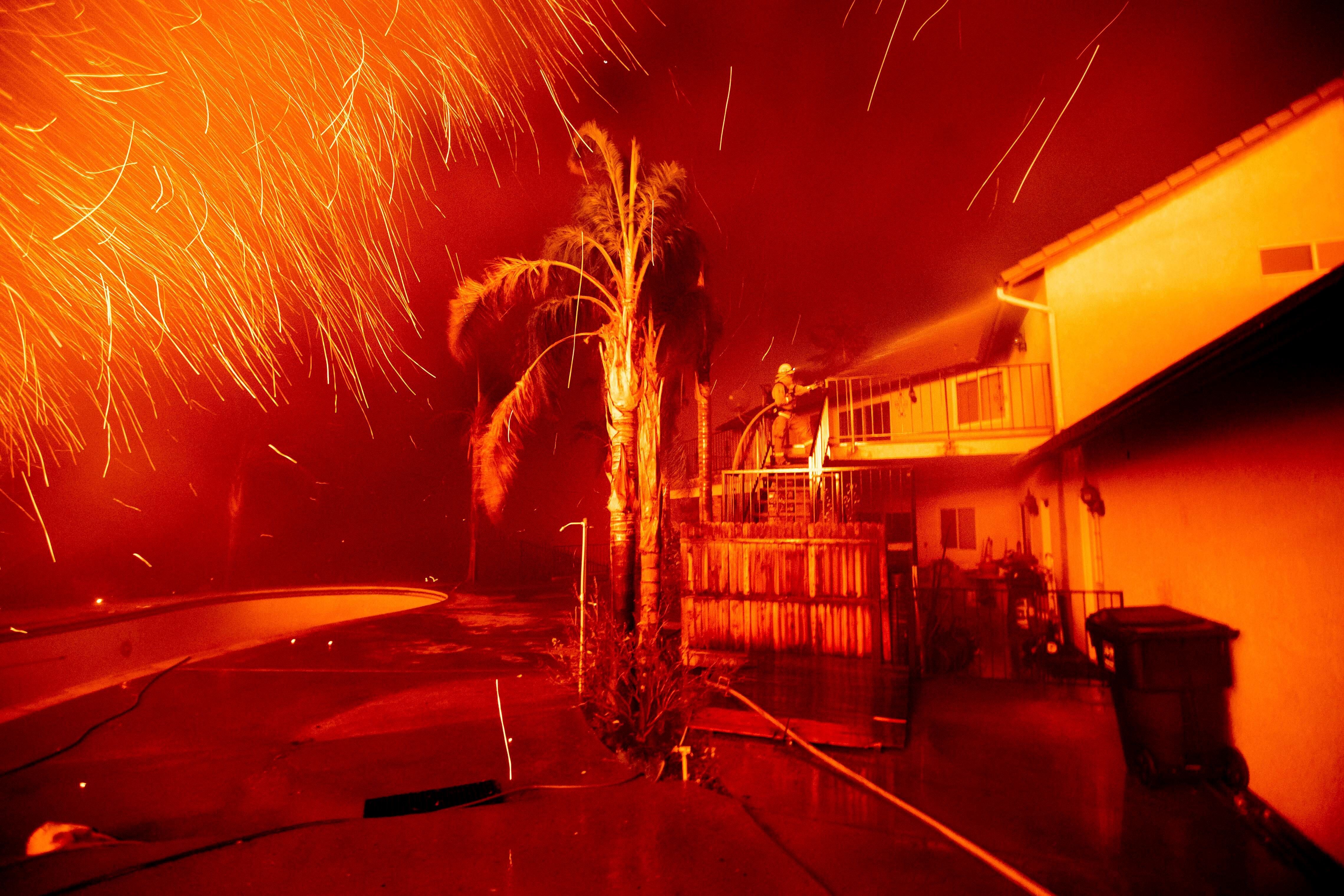 Los bomberos en terrenos empinados apagaban pequeños incendios aunque temían vientos que podrían propagar brasas, dijo el capitán de los Bomberos del Condado de Ventura Steve Kaufmann.