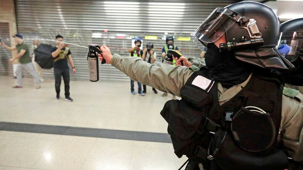Mientras los manifestantes coreaban frases en el centro comercial New Town Plaza en Sha Tin, la policía dijo que ingresaron al inmueble luego de que unos “revoltosos enmascarados” con extintores destrozaron unos torniquetes y rompieron las ventanas de una estación del metro conectada al centro comercial.