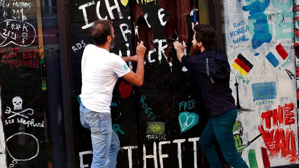 Simulando la manera en la que los berlineses martillaron el muro de concreto hace 30 años, el escultor Patrick Roger y un asistente atacaron la réplica con gusto. Rápidamente hicieron un hueco con sus martillos y estrecharon la mano extendida de alguien que estaba al otro lado.