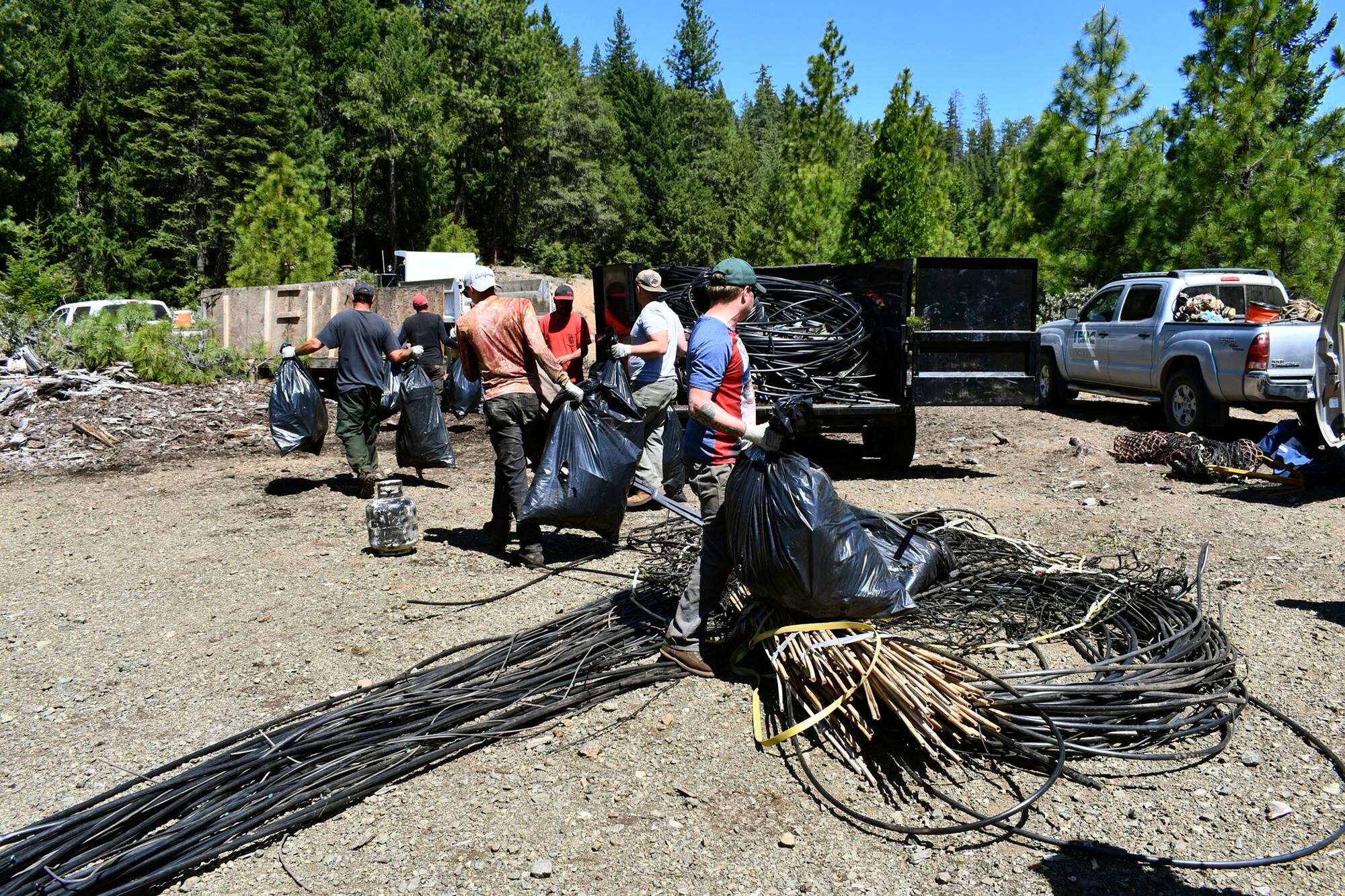 Un grupo que incluye guardabosques del Servicio Forestal de Estados Unidos, fuerzas del orden locales, científicos y conservacionistas ingresó a la zona donde se cultivaron ilegalmente casi 9.000 plantas de cannabis en tierras forestales nacionales en la región conocida como el Triángulo Esmeralda, por la marihuana que se ha producido allí por décadas.