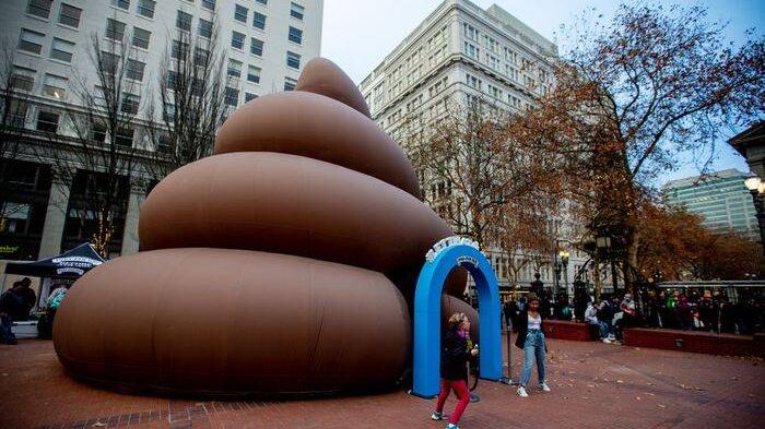 Una instalación de un emoji de excremento de 30 pies de alto amaneció instalada de la noche a la mañana en la Plaza de la Corte de Pioneer, en Portland.