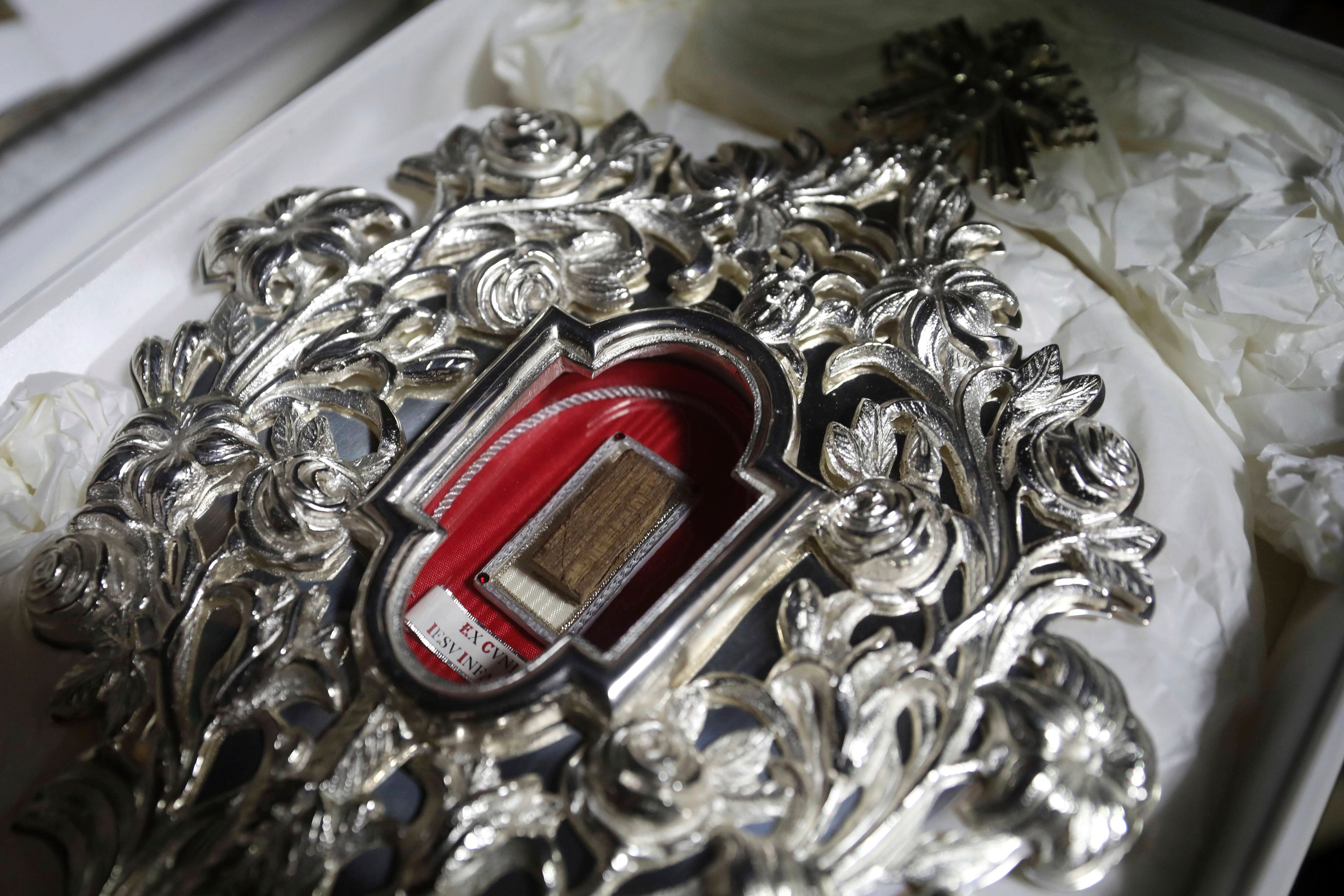 El viernes, medio centenar de feligreses asistieron a una misa especial en la que se expuso la reliquia. El trozo diminuto de madera estaba encerrado en una cruz de plata junto al altar. Después de la misa, los feligreses formaron fila para venerar la reliquia: algunos se arrodillaron y otros besaron la caja de vidrio.