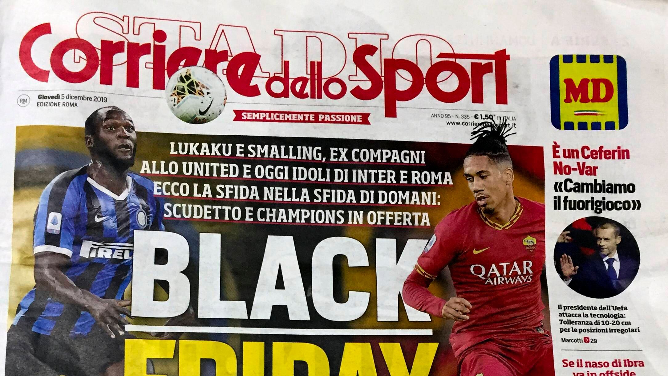 Corriere dello Sport publicó fotografías del defensor Chris Smalling, de la A.S. Roma, y del atacante Romelu Lukaku, del Inter Milán, en un artículo previo al partido que disputarán ambos clubes mañana en Milán.