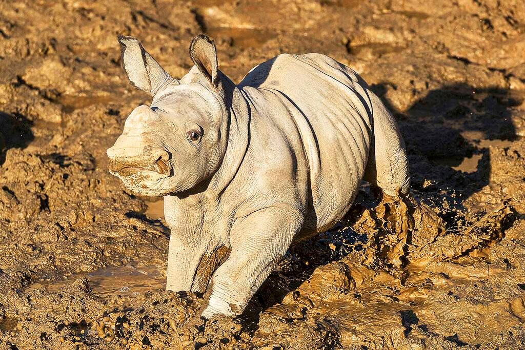 Los rinocerontes generalmente se cubren con una gruesa capa de lodo que ayuda a actuar como un bloqueador y repelente de insectos, además de que les ayuda a mantenerse frescos.