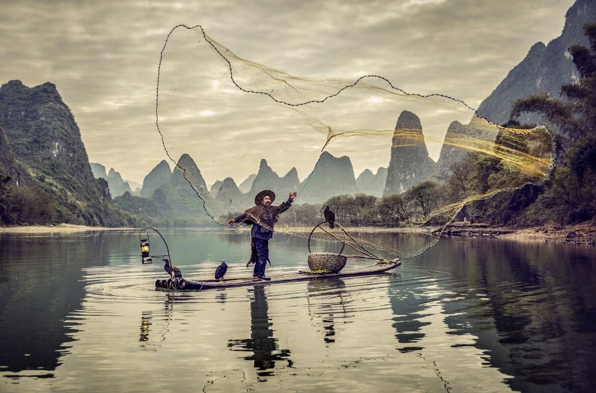 Y si hablamos de Guilin, es imposible ver una de sus señas de identidad, pescadores de cormoranes flotando en sus frágiles barcos de bambú. Estas aves son entrenadas para pescar durante al menos 8 años antes de que puedan ser utilizadas en el trabajo diario. Los lugareños salen al río al amanecer y se mueven en silencio. La oscuridad del río sólo está parcialmente rota por la tenue luz de una linterna de queroseno que permite ver la posible presa. Las aves se lanzan al agua cuando detectan a los peces y los capturan. Después, los pescadores ‘vacían’ la garganta de los animales.