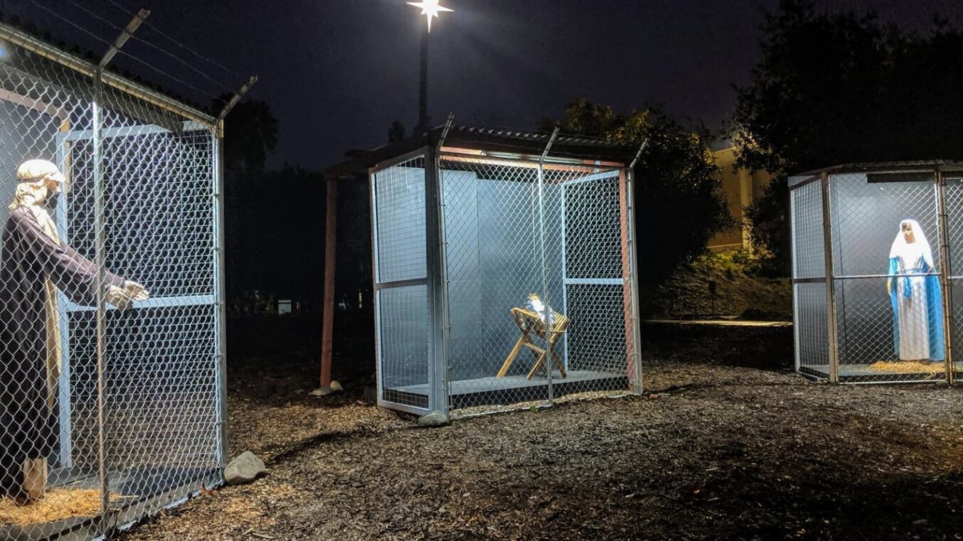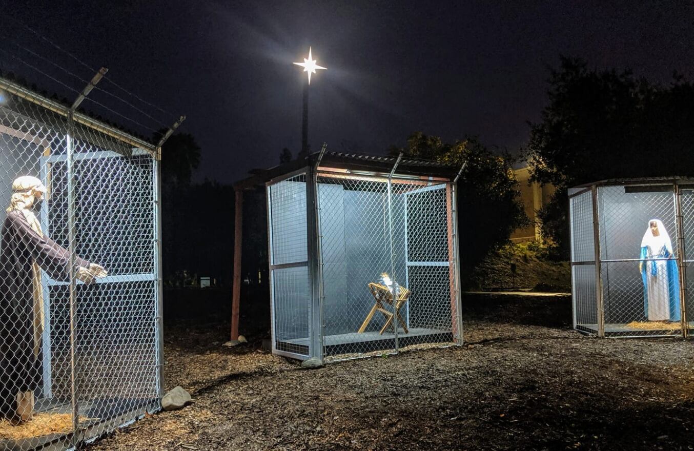 Recientemente, la Iglesia Metodista Unida Claremont, en el sur de California, representó a la Sagrada Familia – María, José y Jesús en el pesebre – como detenidos. Cada figura está colocada en una jaula de alambre de púas, parecida a la de los refugiados en los centros de detención fronterizos.