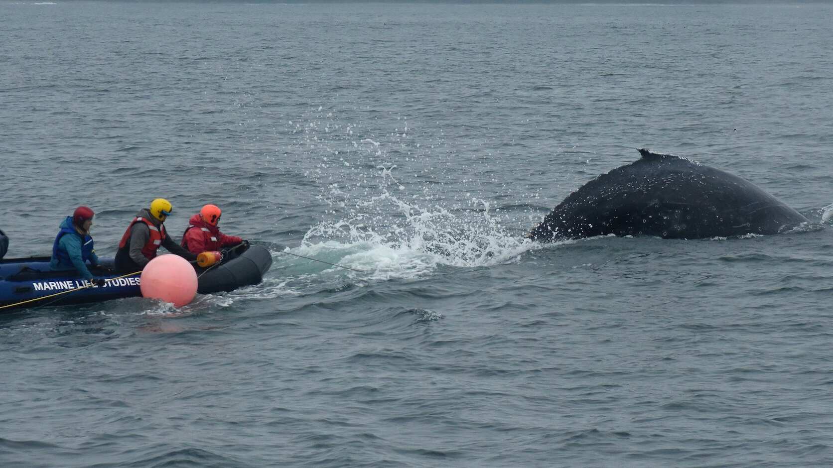 Los rescatistas a bordo de un pequeño bote inflable en la bahía Monterey conectaron cinco boyas grandes de color rosa a la línea de pesca para hacer desacelerar a la ballena y mantenerla cerca de la superficie el viernes, dijo Peggy Stap, fundadora y directora ejecutiva de Marine Life Studies, un grupo de conservación del norte de California.