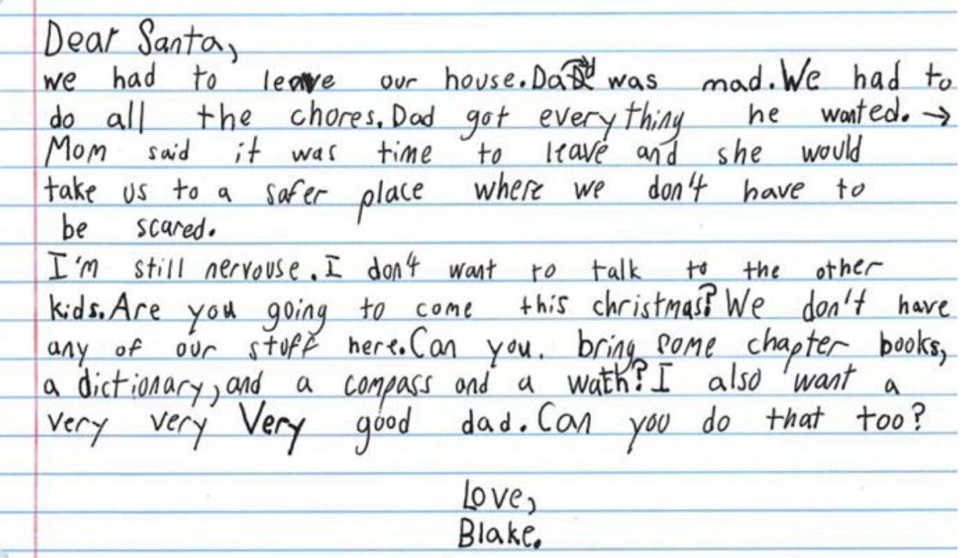 “Querido Santa, Teníamos que salir de nuestra casa. Papá estaba enojado. Teníamos que hacer todos los quehaceres. Papá consiguió todo lo que quería. Mamá dijo que era hora de irnos y que nos llevaría a un lugar más seguro donde no tenemos que tener miedo. Todavía estoy nervioso. No quiero hablar con los otros niños. ¿Vas a venir esta Navidad? No tenemos ninguna de nuestras cosas aquí. ¿Puedes traer algunos libros de capítulos, un diccionario, una brújula y un reloj? También quiero un muy, muy, muy buen papá. ¿Puedes hacer eso también? Con amor, Blake”.