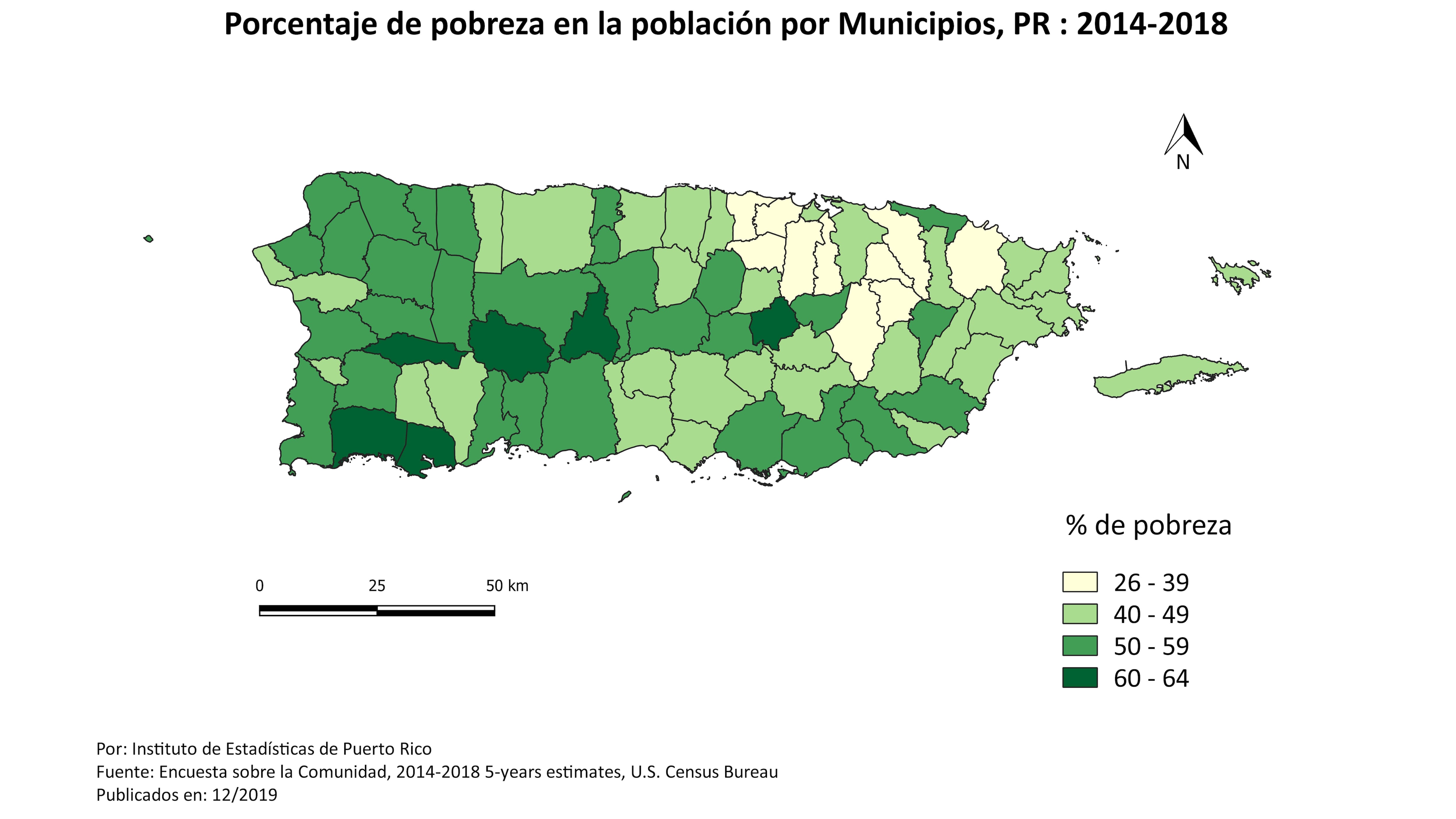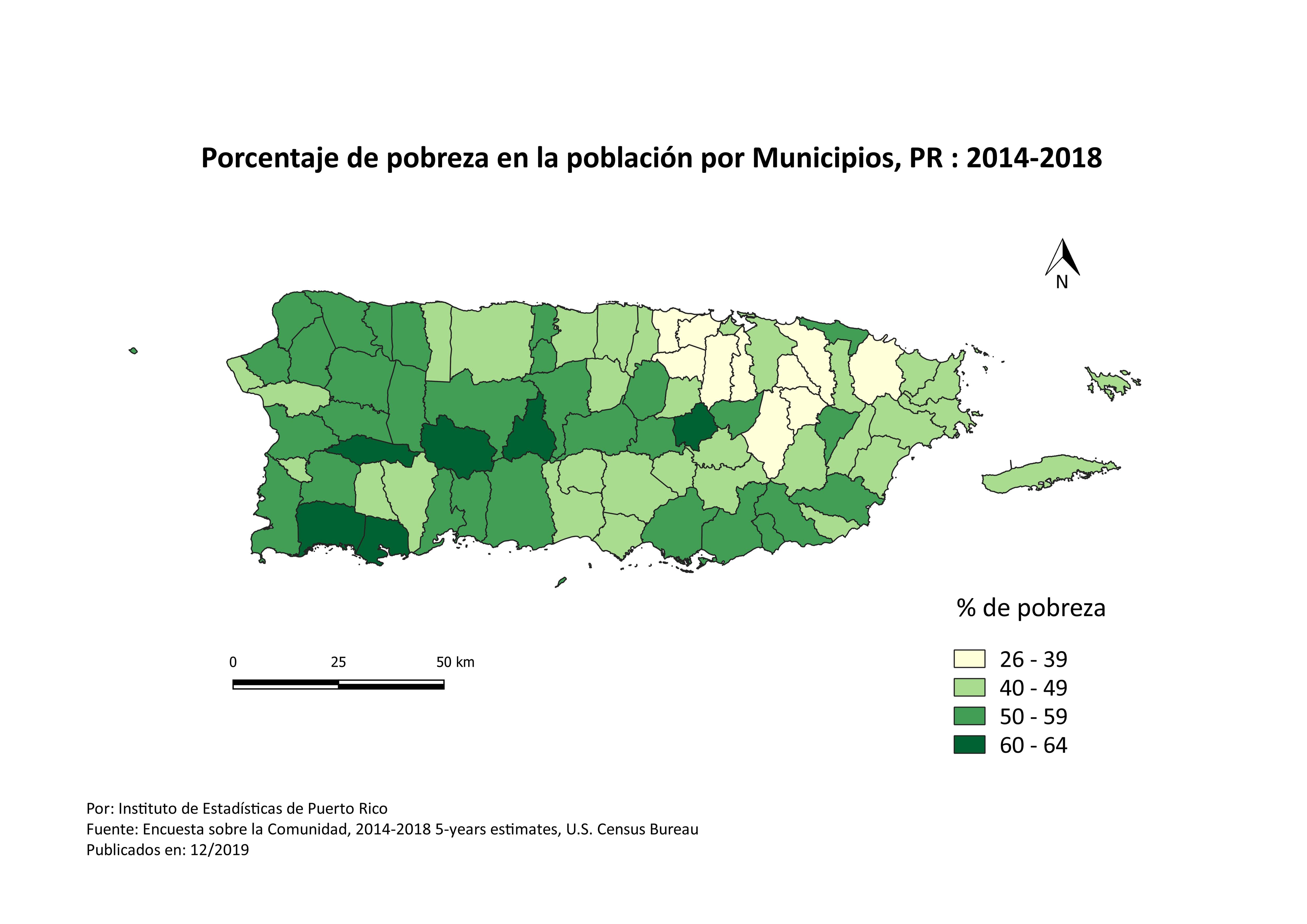 De esos 36 municipios, en 6 de ellos el nivel de pobreza alcanzó entre 60 por ciento a 64 por ciento, siendo estos Maricao, Guánica, Adjuntas, Lajas, Jayuya y Comerío. Es decir, 6 de cada 10 personas en los municipios antes mencionados están en pobreza. Estas estadísticas hacen referencia a la información recopilada por un periodo de 5 años, desde el 2014 al 2018. La nueva publicación provee datos sobre características demográficas, sociales, económicas y de vivienda para Puerto Rico y los municipios, así como para niveles geográficos específicos como barrios, tramos censales y grupos de bloque.