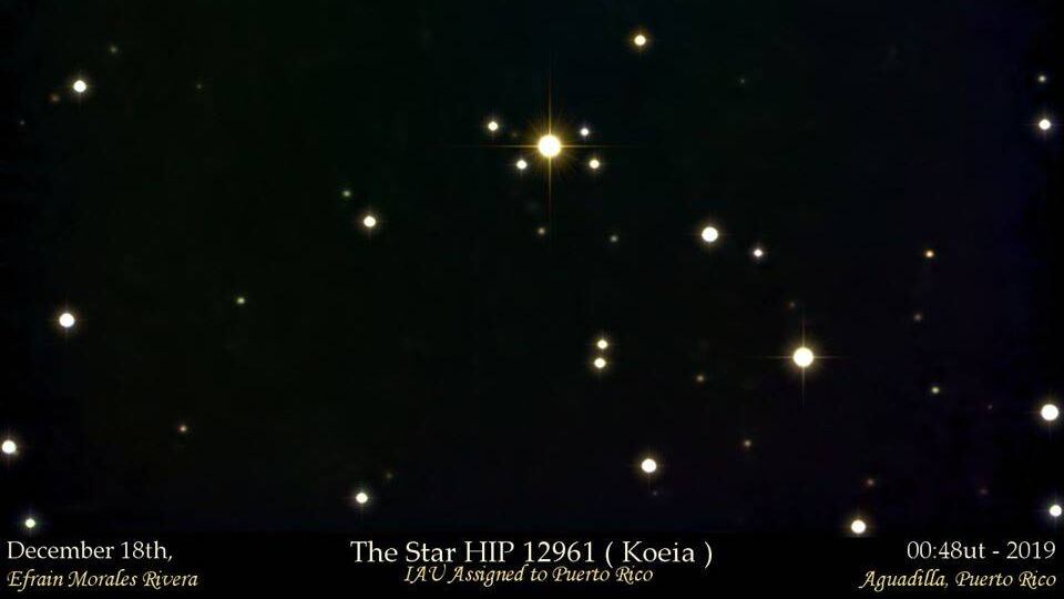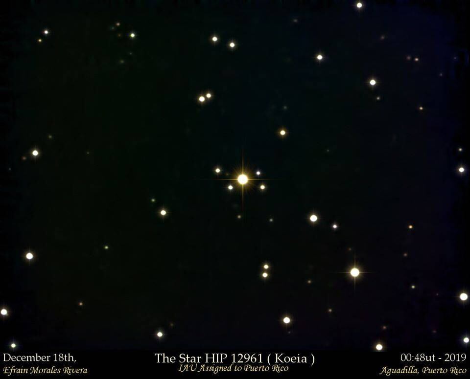 A Puerto Rico se le asignó la estrella “HIP 12961” y luego de una selección de varios nombres propuestos, mediante votación se escogió el nombre de “Koeia” para dicha estrella, mientras que un planeta que la orbita ha sido llamado “Aumatex”.