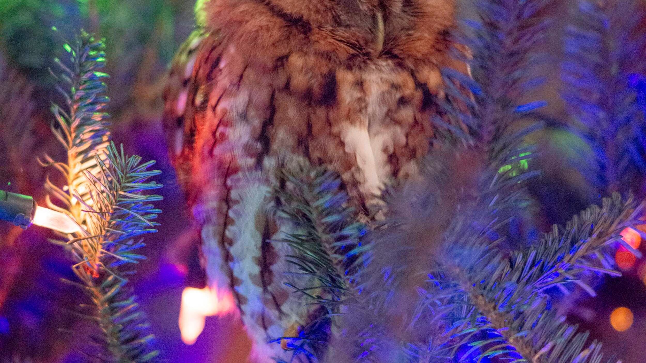 Una familia escuchó un raro sonido en su árbol de Navidad y, más de una semana después de que lo compraron, encontraron un búho vivo acurrucado entre las ramas.