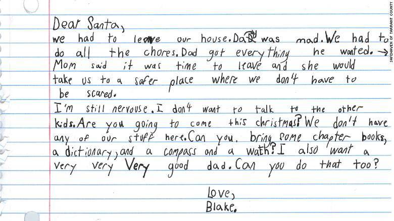Su madre encontró una carta escrita a mano en su mochila hace unas semanas y la compartió con el personal de SafeHaven del condado de Tarrant, un refugio para víctimas de violencia doméstica en Fort Worth, Texas, dijo a CNN su presidenta y directora ejecutiva, Kathryn Jacob.