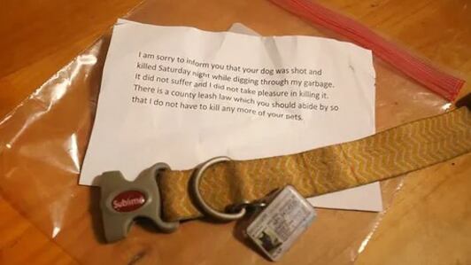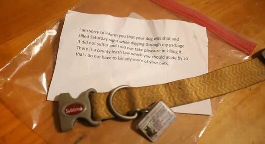 “Lamento informarle que su perra murió baleada la noche del sábado cuando escarbaba en mi basura”, decía la nota anónima, según el periódico The Sun Herald. “No sufrió y no me dio placer matarla. Hay una ley de uso de correa en el condado que debería acatar para que no tenga que volver a matar a más de sus mascotas”.
