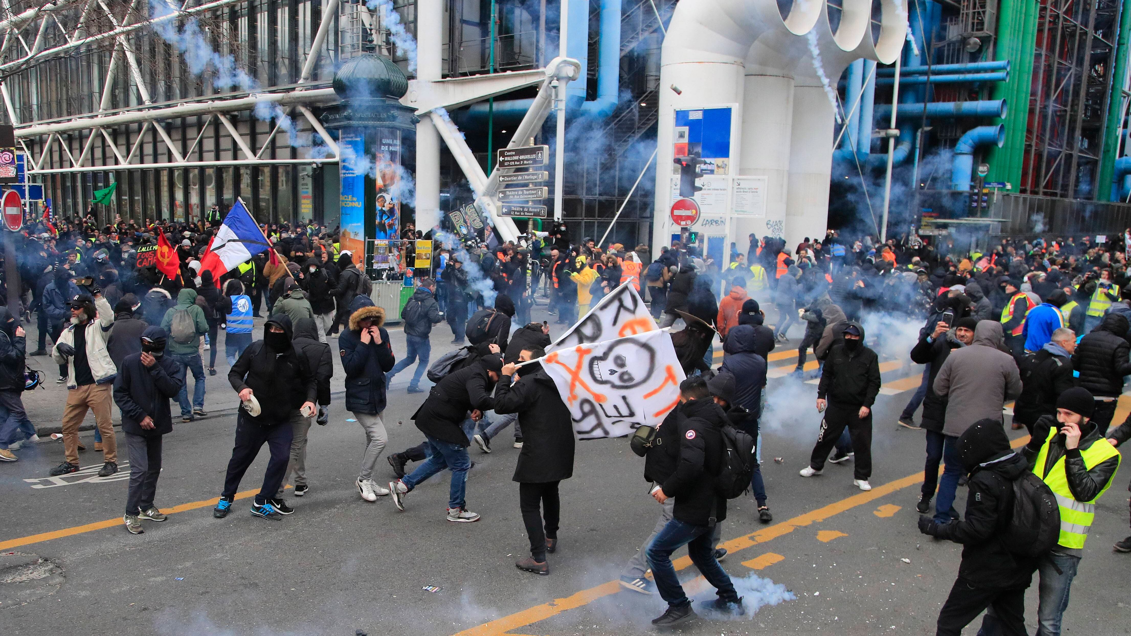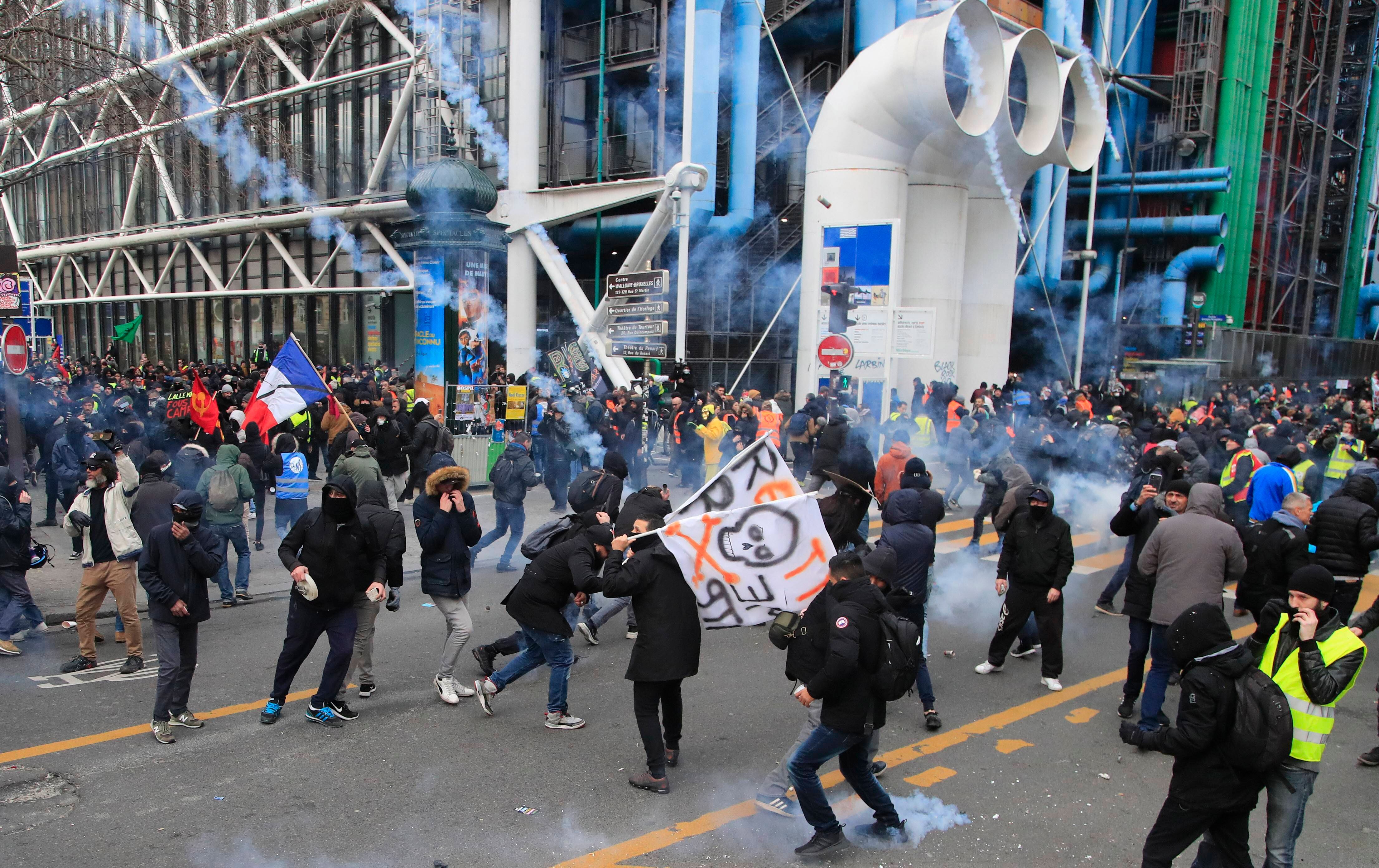 En un gesto inusual, los sindicatos que organizaron la protesta les pidieron a los manifestantes del movimiento de los chalecos amarillos que los acompañaran. Fue el 59mo sábado consecutivo de marchas de ese movimiento que pretende obtener justicia social y económica.