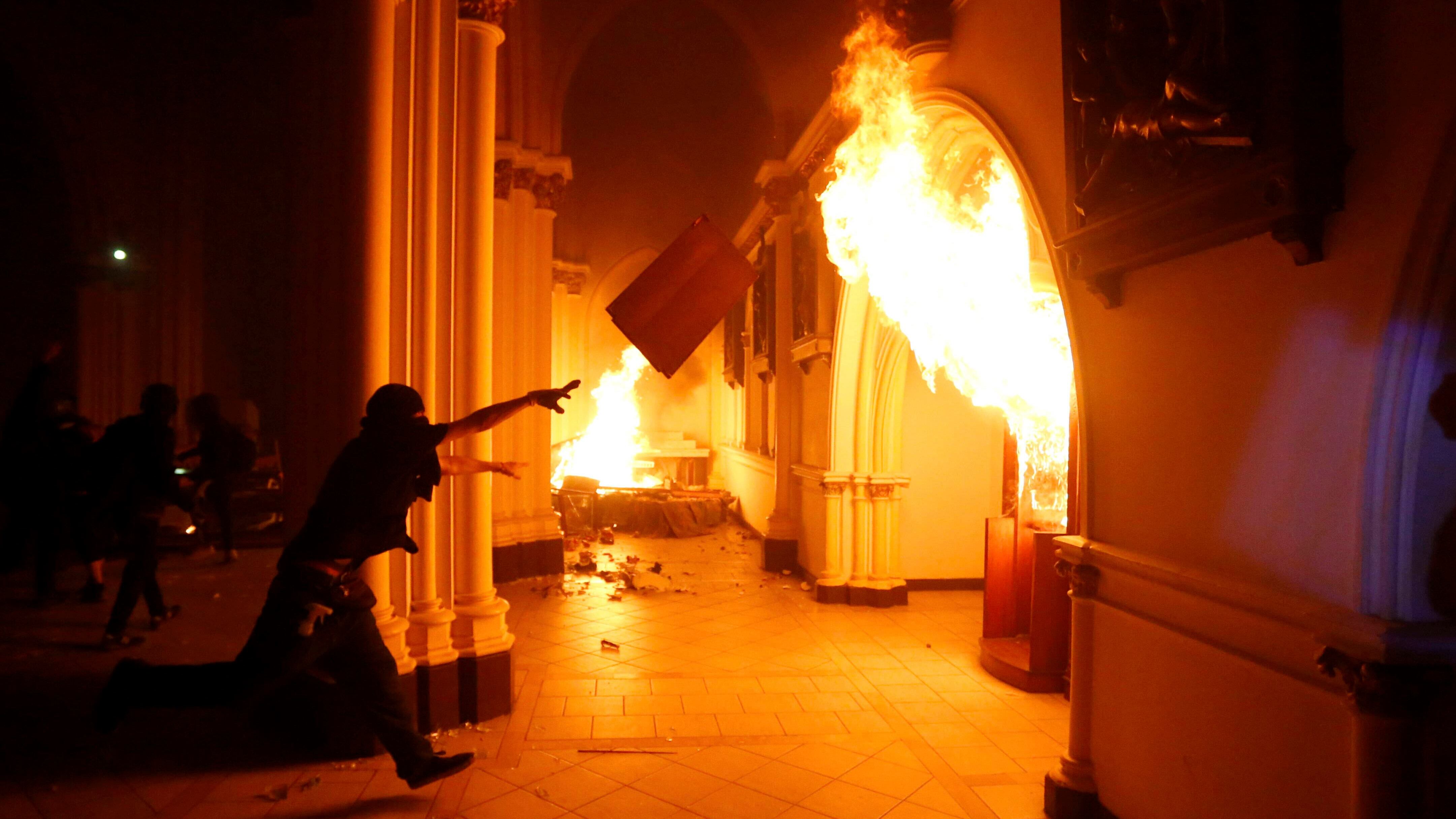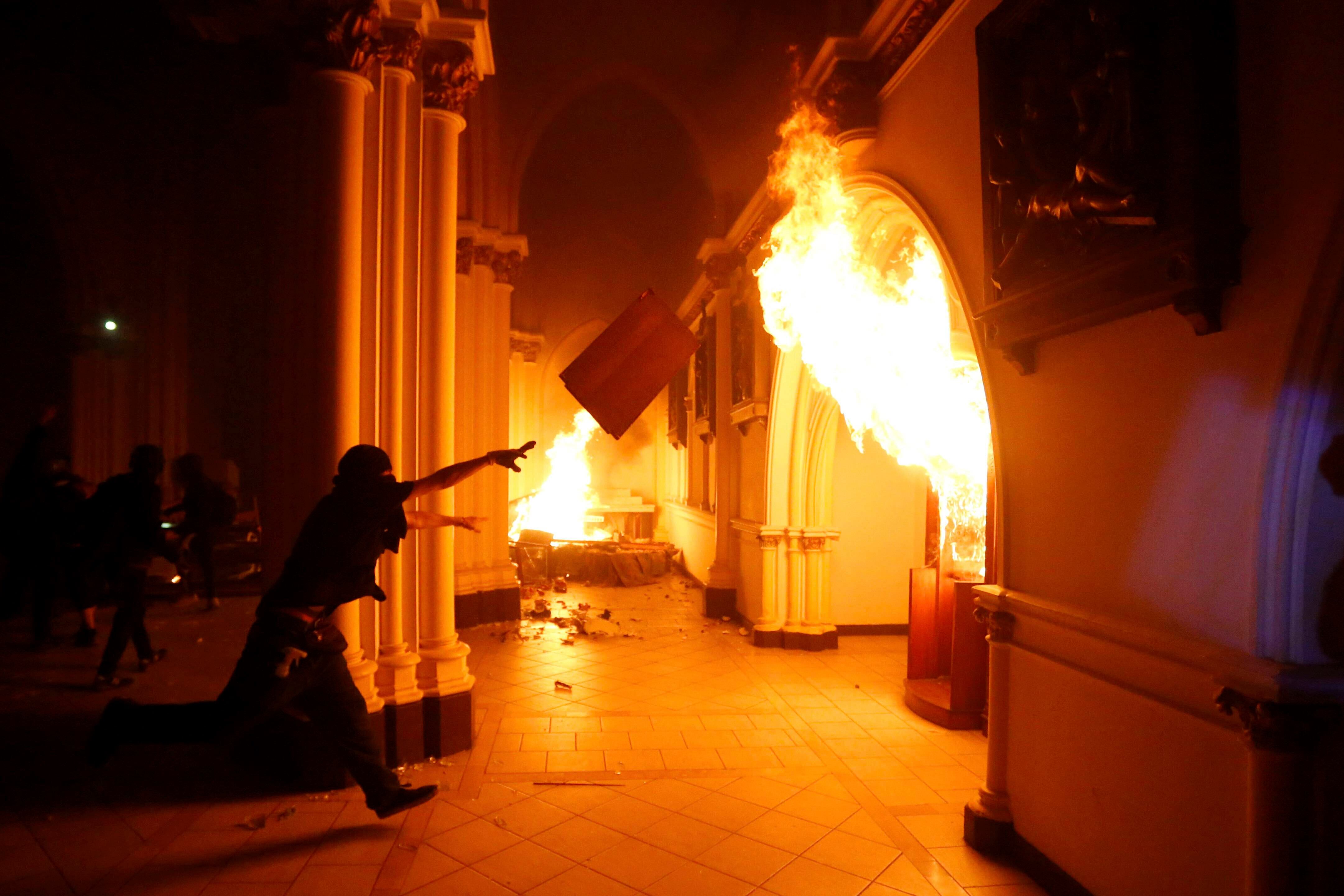 Una capilla de la policía chilena fue saqueada e incendiada el viernes por encapuchados que profanaron el templo situado a un par de cuadras de una plazoleta que es escenario de protestas sociales desde hace meses que demandan mejoras profundas en la calidad de vida de los chilenos.