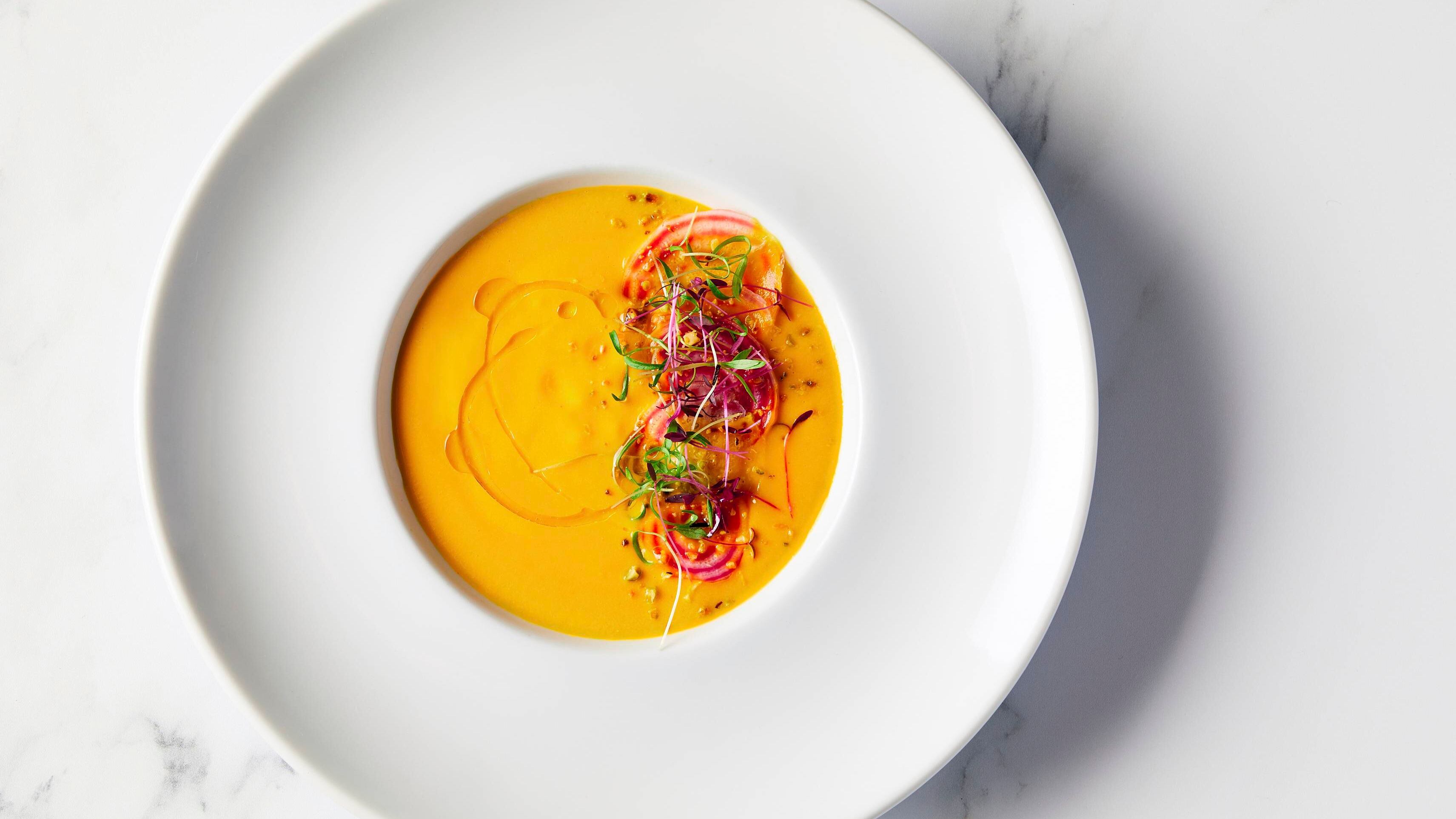 El platillo fuerte incluye escalopas de setas de cardo y risotto de hongos silvestres, junto con zanahorias y coles de Bruselas verdes y moradas rostizadas. Una sopa fría de betabel amarillo será servida como aperitivo.