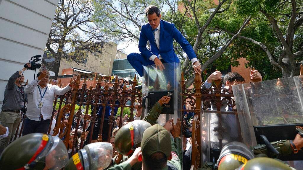 Apretadas filas de guardias nacionales con uniformes verdes impidieron la entrada a Guaidó y otros legisladores de oposición. En un momento dado, el líder opositor intentó escalar la cerca de la Asamblea Nacional, y fue obligado a bajar con tirones a su traje.