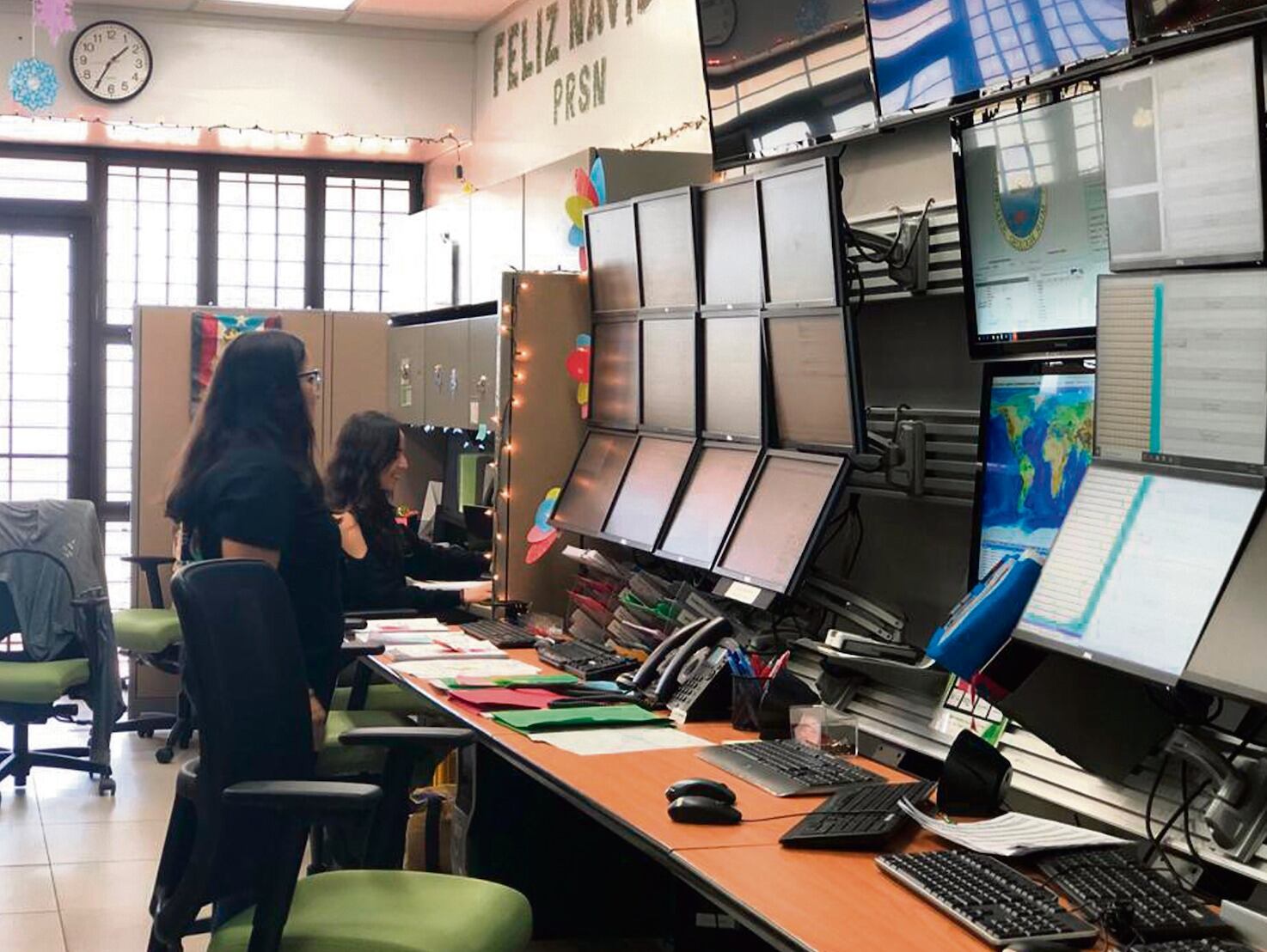 Tras navegar por cada recoveco del Recinto Universitario de Mayagüez de la Universidad de Puerto Rico a la que está adscrita, finalmente, te recibe el equipo con el que estas personas estudian cada latido de la tierra: monitores, teléfonos (tantos como si fueran los de Batman), radios y otros instrumentos que colman el pequeño espacio científico.