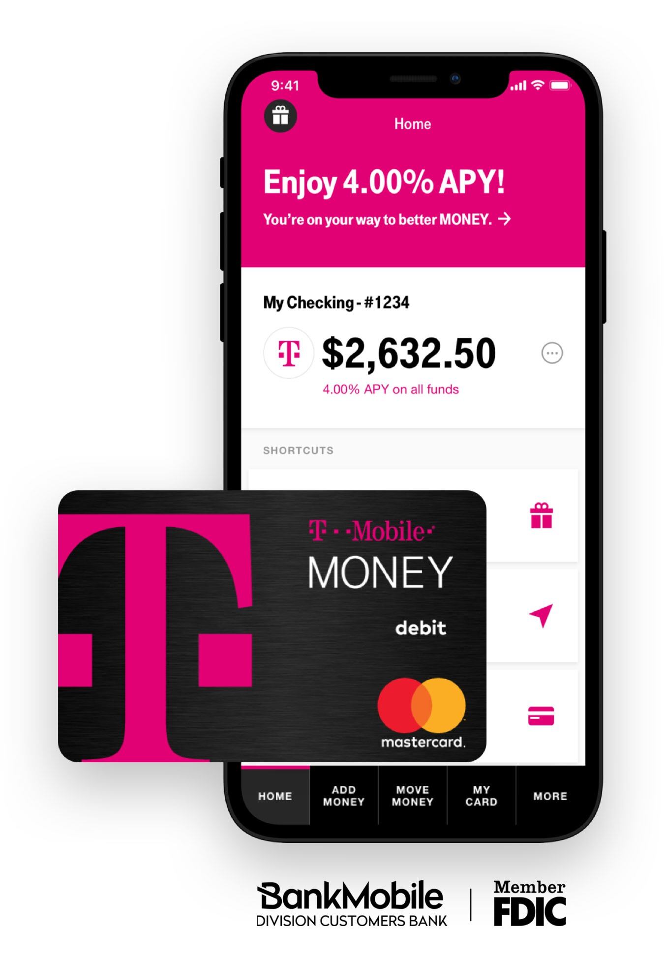 T-Mobile MONEY también ofrece una tarjeta de débito Mastercard® que puedes usar en más de 55,000 cajeros automáticos Allpoint en todo el mundo. T-Mobile MONEY se creó en asociación con BankMobile, una división de Customers Bank (Miembro FDIC), y ha estado disponible de manera piloto desde noviembre de 2018. Los depósitos de T-Mobile MONEY están asegurados por la FDIC hasta $ 250,000.