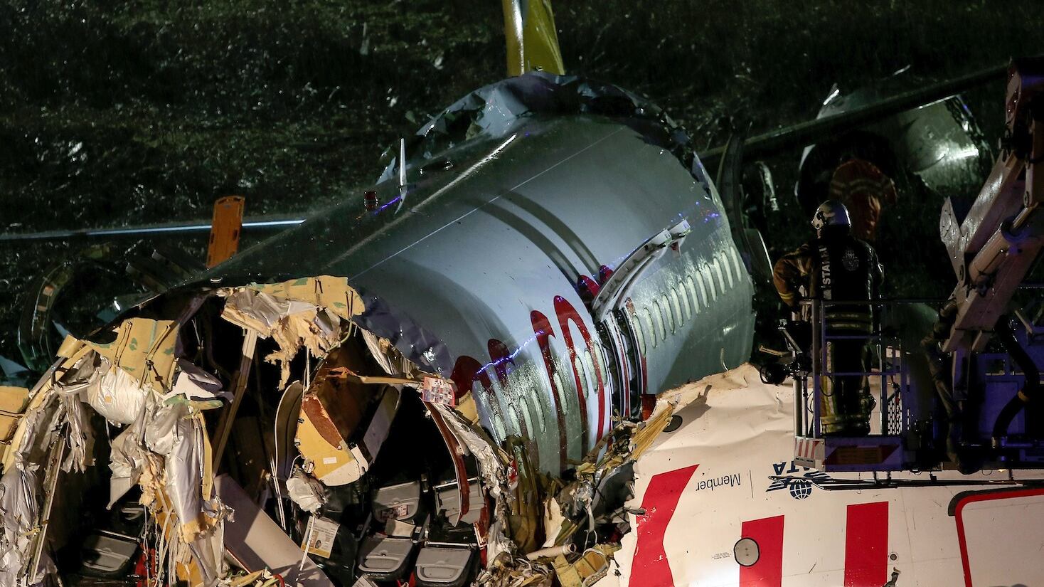Un avión se salió de la pista el miércoles mientras intentaba aterrizar en un aeropuerto de Estambul y se estrelló en un campo para luego partirse en pedazos. Una persona murió y decenas más resultaron heridas, y los pasajeros tuvieron que bajar por las grietas del avión.