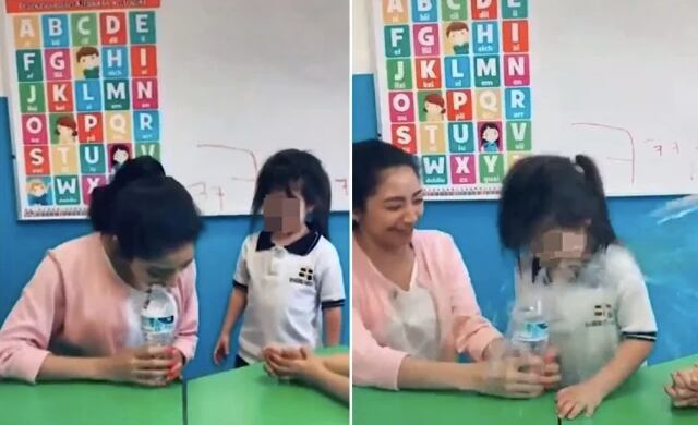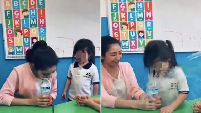 Cuando la alumna se acercó y miró con uno de sus ojos, la profesora apretó la botella y el agua salió disparada. Entonces, terminó mojándole todo el uniforme a la pequeña niña.