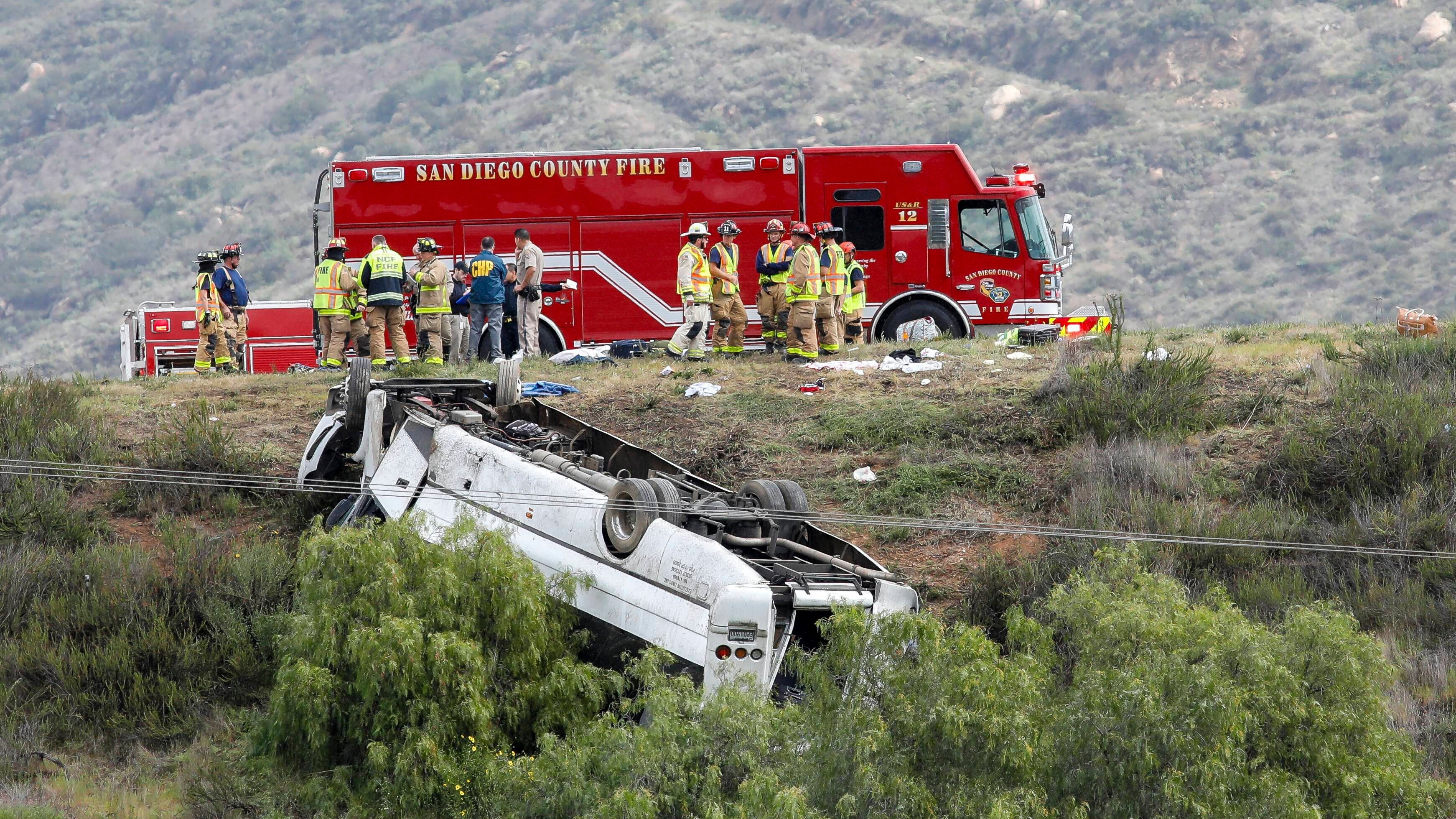 Varios pasajeros salieron expulsados del autobús y uno de ellos falleció prensado debajo de la unidad, cuyos neumáticos quedaron hacia arriba después de salirse de la Interestatal 15 a las 10:00 de la mañana en Pala Mesa, una comunidad no incorporada a unos 72 kilómetros (45 millas) al norte de San Diego, dijo el portavoz del Distrito de Protección contra Incendios del condado North, John Choi.