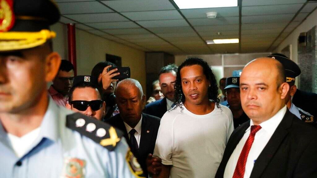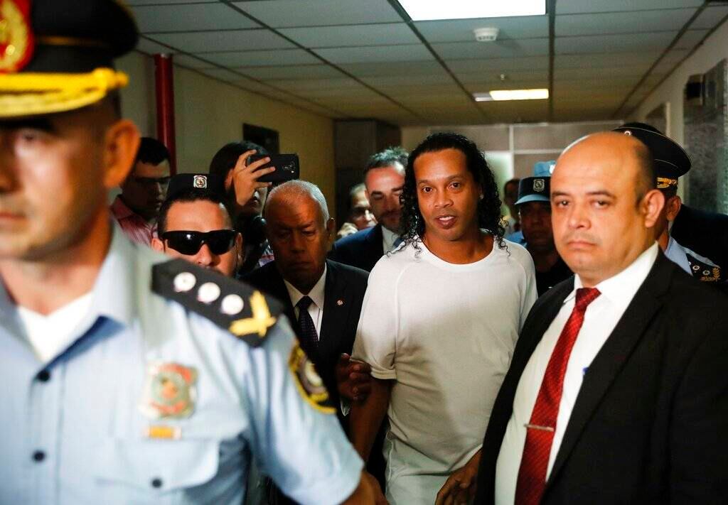 El jugador de 39 años y su hermano Roberto Assis fueron arrestados la noche del viernes en un hotel de la capital de Paraguay. Ambos aparecieron el sábado esposados y Ronaldinho trataba de ocultar las esposas bajo un trozo de tela lila.