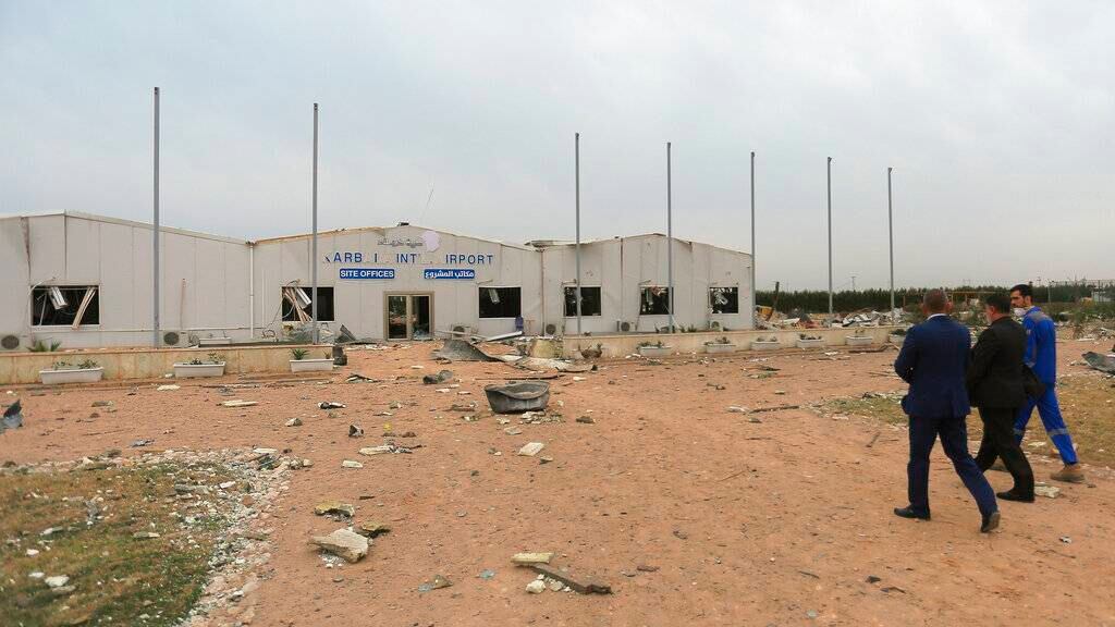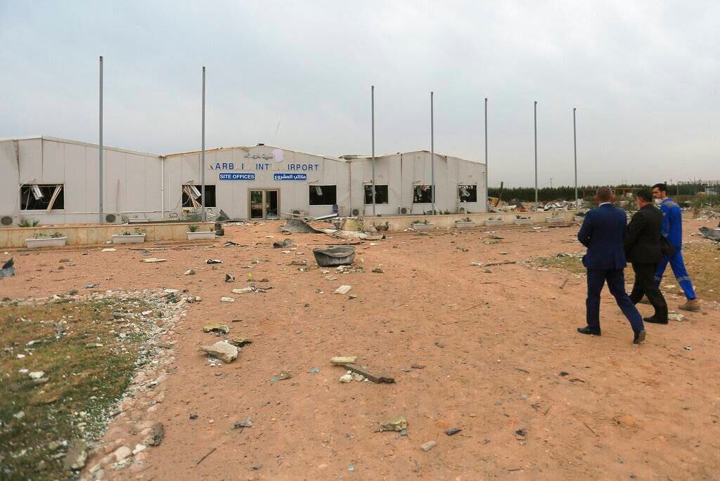 Un enorme cráter quedó tras el ataque de Estados Unidos en las afueras del aeropuerto del Karbala, en desuso. Las fuerzas iraquíes inspeccionaron un área cubierta de vidrios rotos y escombros.