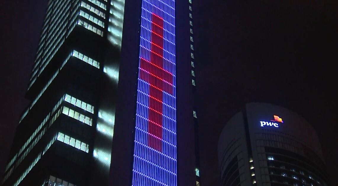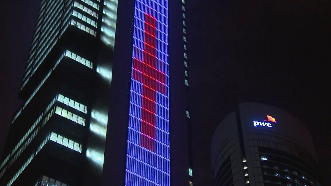 Las imágenes muestran las Cuatro Torres iluminadas con mensajes en inglés y en español, así como con la bandera de España y el símbolo de la Cruz Roja.