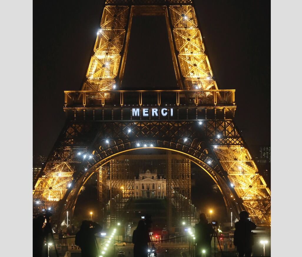 Las luces deletreaban “Merci” (Gracias, en francés) y “Stay at home” en inglés (Quédense en casa) junto con la acostumbrada iluminación de la torre.